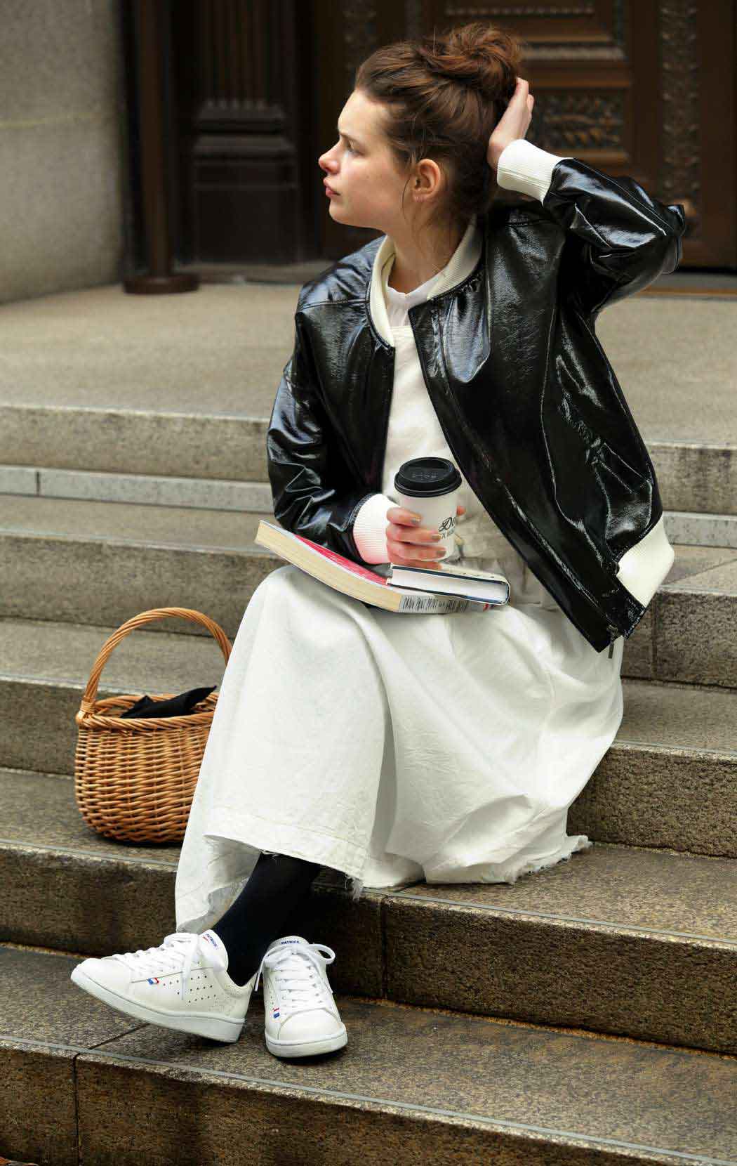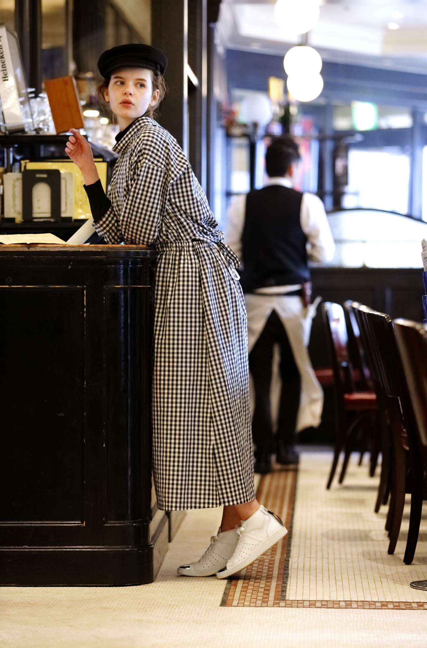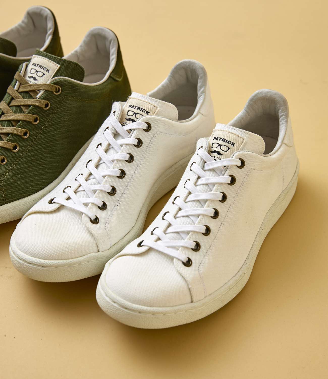 - テニスシューズをモチーフにしたスタンダードモデル「QUEBEC」。トレードマークの2本ラインはパンチングで表現、よりシンプルで洗練されたデザインに。清潔感のある雰囲気は、ガーリーなスタイルにも程よく馴染む。