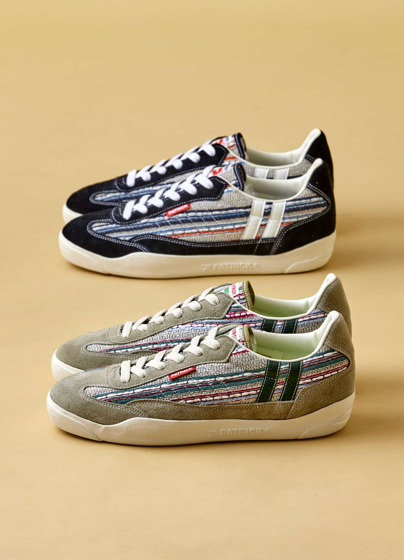- フランス時代のスカッシュシューズをベースに、インポートのジャガード織を使用。効き色の組み合わせの妙さを感じさせる配色と、立体感がある太糸を織り混ぜたインポートならではの一風変わったストライプ柄が特徴的。