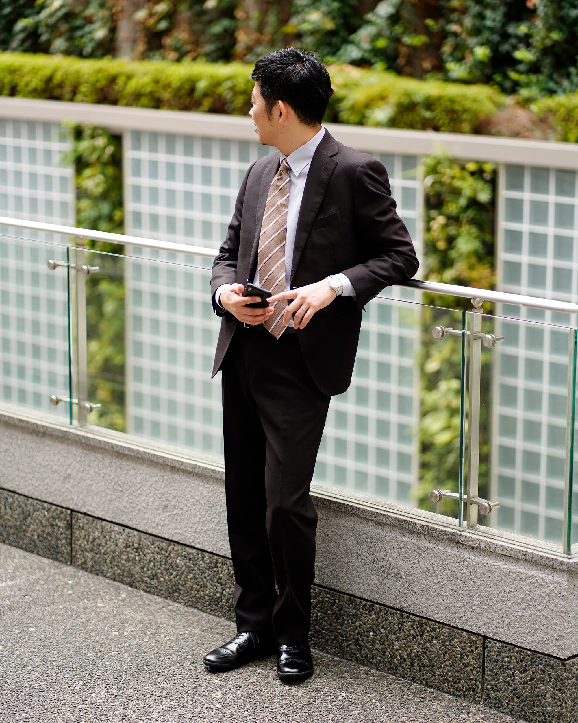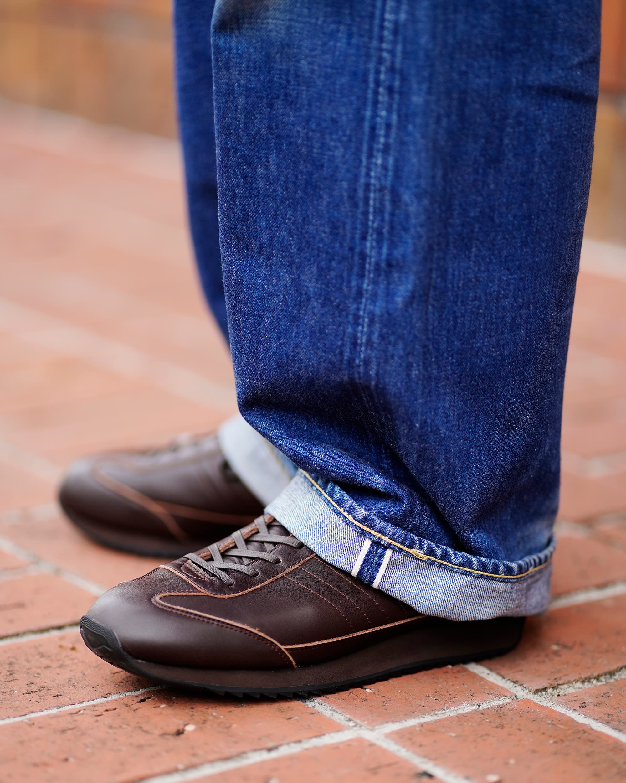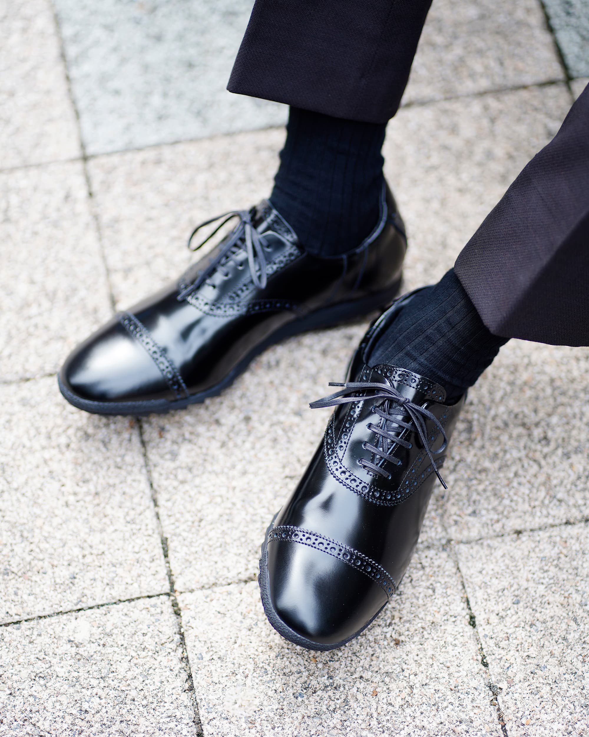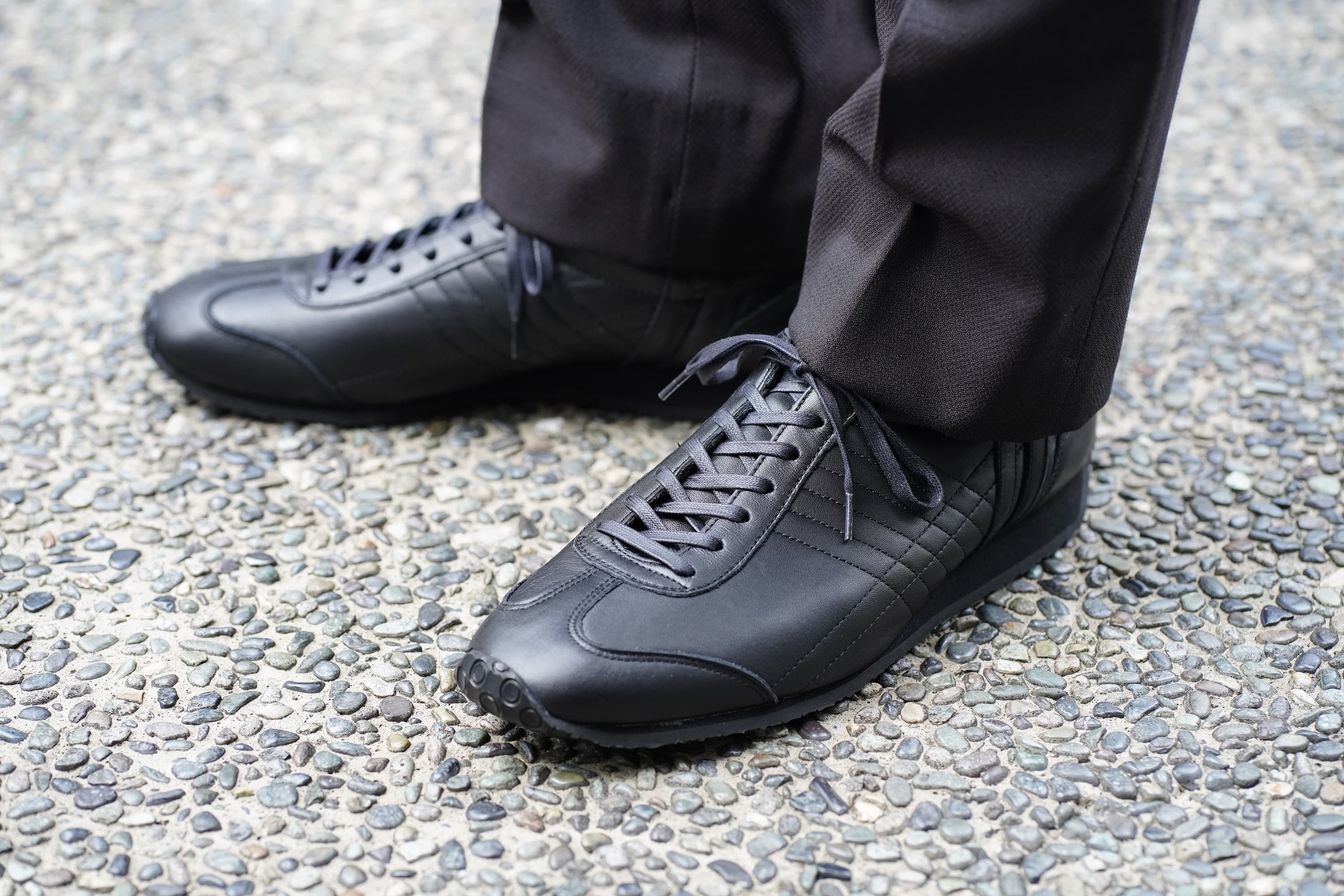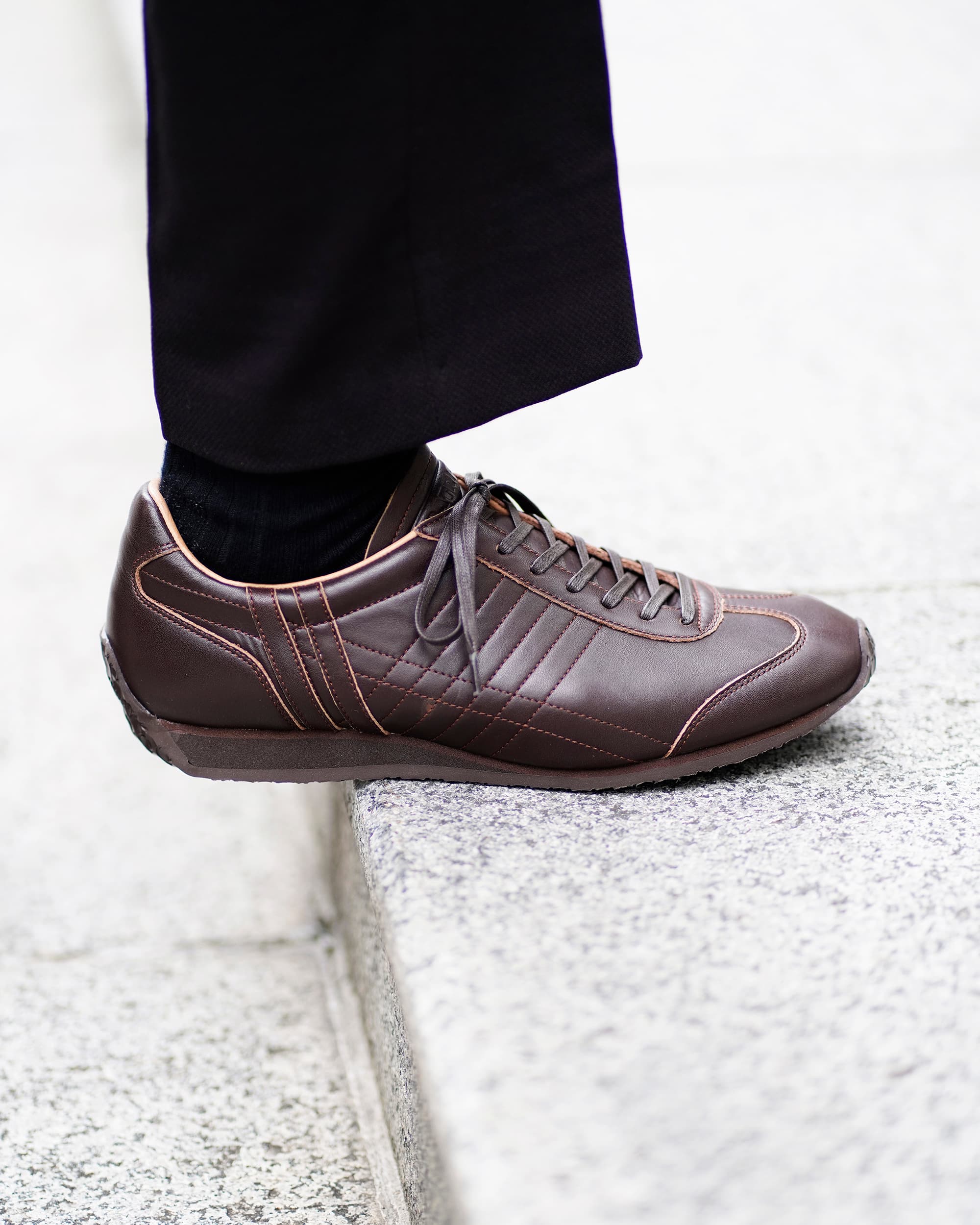カピトはスーツシーンの合わせのお手本のようだ。てらてらと光沢を放つ漆黒のそれがブラウン系のスーツによく合う。同系色を合わせるという意味ではカラー違いの「チョコ」もいいかもしれない。そして、余裕があれば普段履きとの相性も頭の片隅に入れておきたいところ。さて、肝心な履き心地の部分を考えてみる。「履き初めから足に馴染んでスニーカーそのものだ」とはいかず、革靴ほどではないにしろ、多少の革の硬さも感じ、履き口も狭く、なんなら革靴特有の「あたり」もある。そういったことを踏まえると躊躇するかもしれないが、こういうものは一度履いてしまえば次第に馴染み解決していくもの。一度扉を開けてしまえば新たな靴との第一歩がはじまる。※こちらは防水モデルではありません