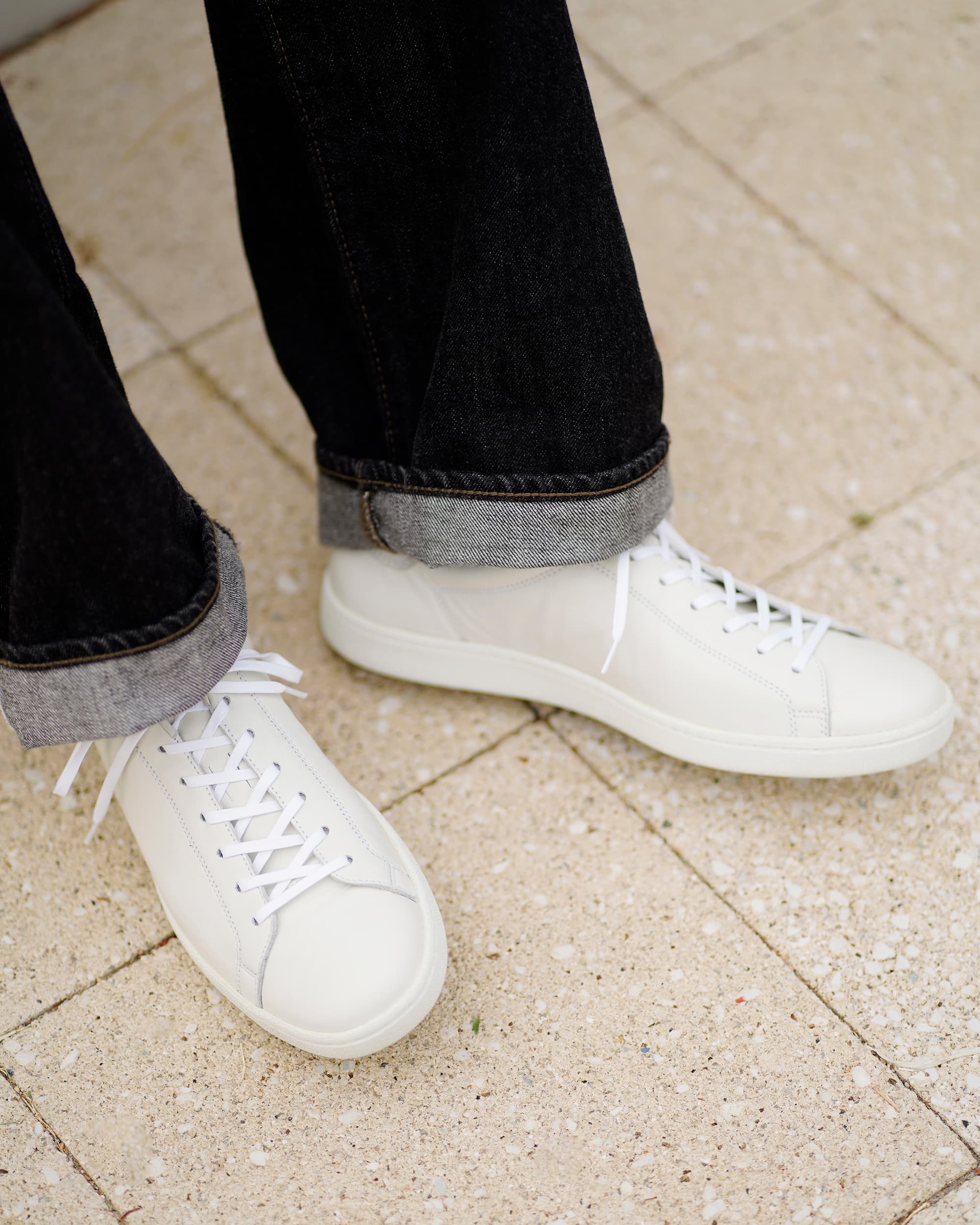 誰しも最初にスニーカーを買うのは、普段履きを想定してのことでしょう。となれば、ホワイトの無地がまず間違いない。清潔感もあり、常にトレンド感も感じられる。合わせ方は無限に用意されていて、その万能さはどこか誠実です。シンプルだけど上品さと高級感を感じられるのは素材の良さとデザインがうまく融合されているから。機能面では、パーツの縫製にも撥水性糸を使用しているのに加え、シューレースには防水性のある蝋引きタイプを採用するなど、細部までこだわりをもって作られています。