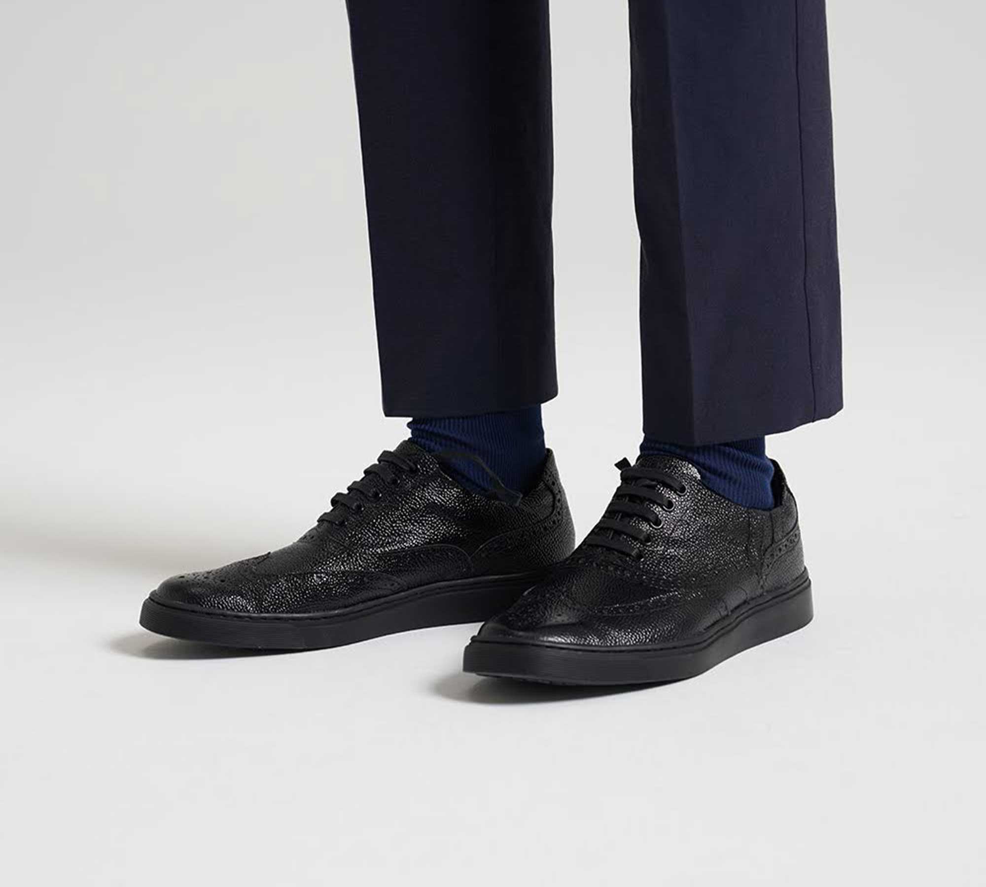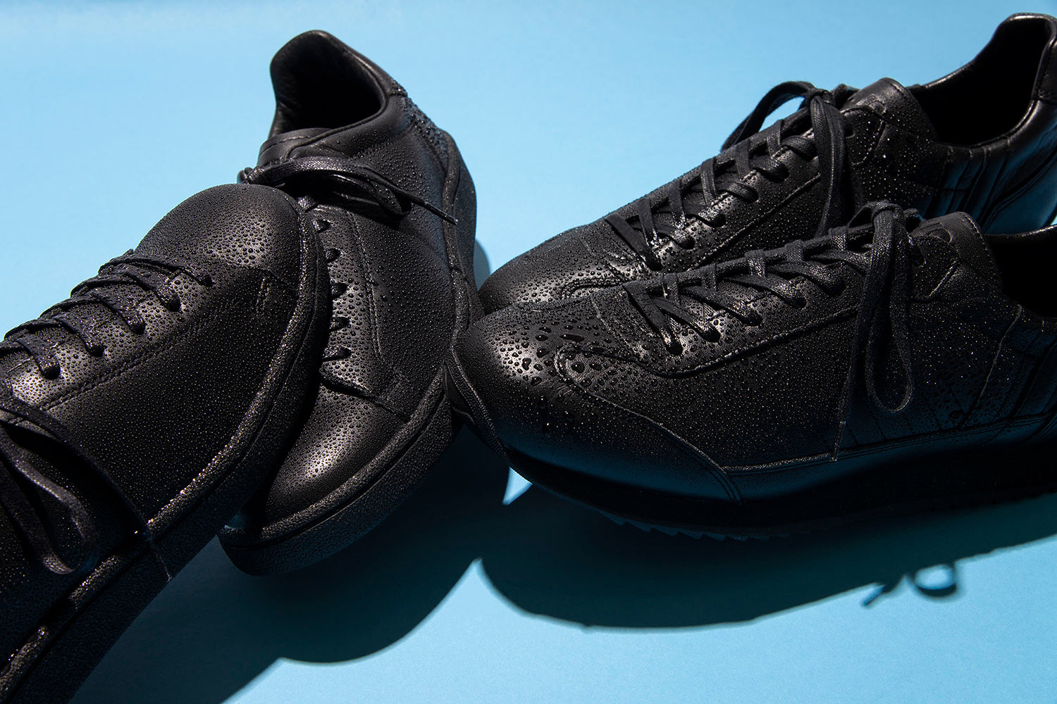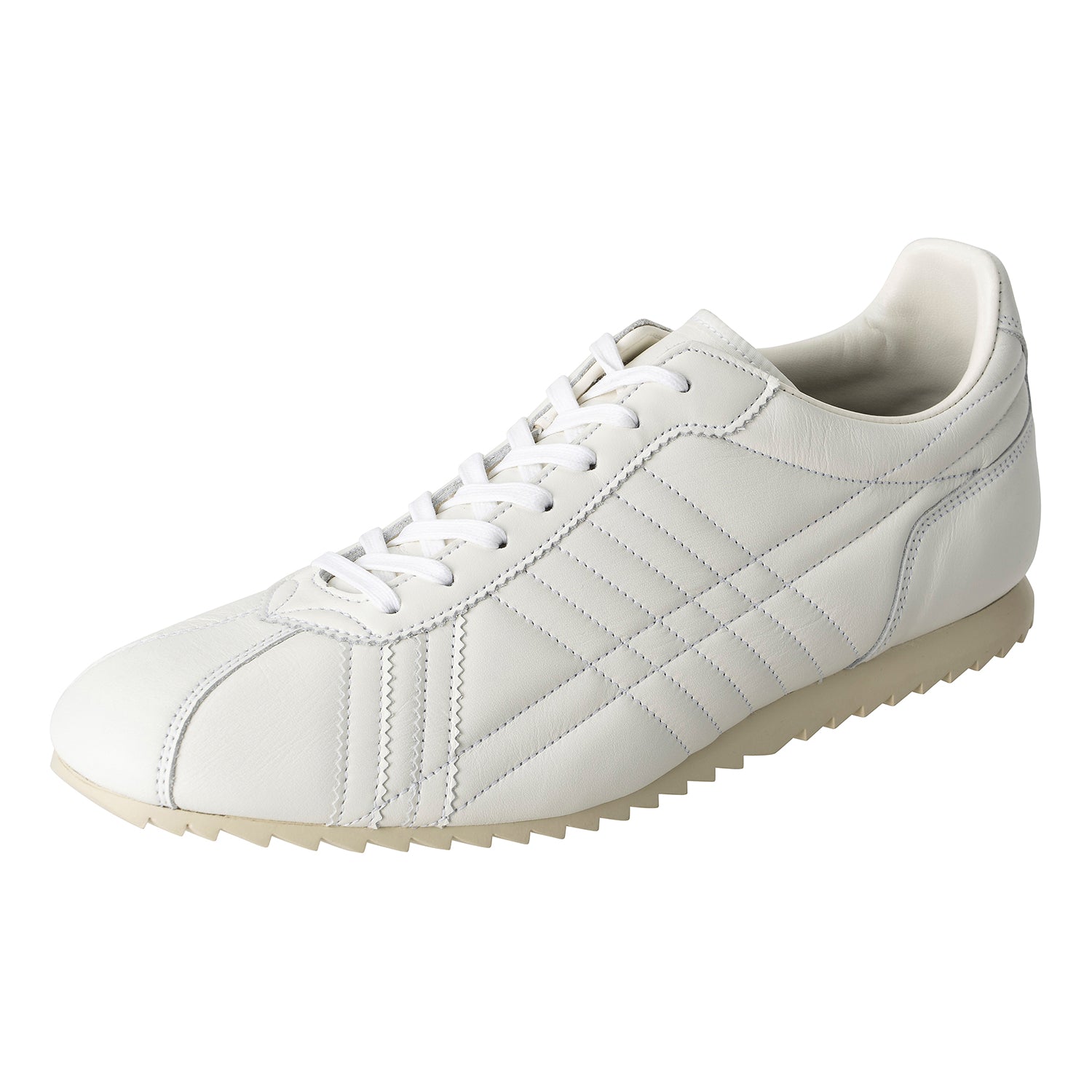 メダリオンが装飾されたアッパーが印象的なスニーカー。ステアレザーに凹凸の型押しを施しました。表面にはウレタン塗料を仕上げることで、漆のような風合いを表現するとともに、普段使いにも適した耐水性を実現。更に、クッション性の高いソールを採用し、ビジネスシーンを足元からオシャレにかつ機能的にサポートします。※こちらは防水モデルではありません
