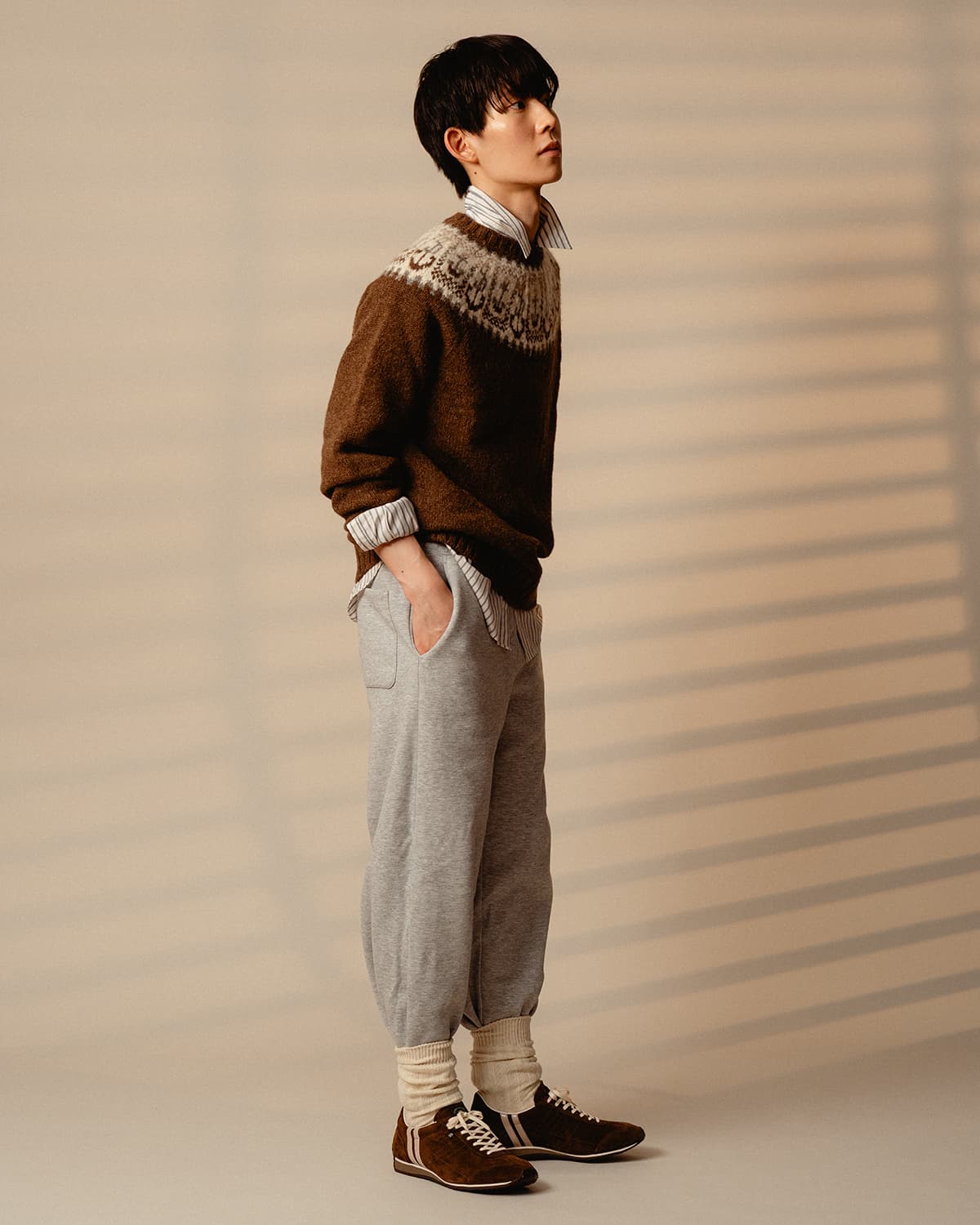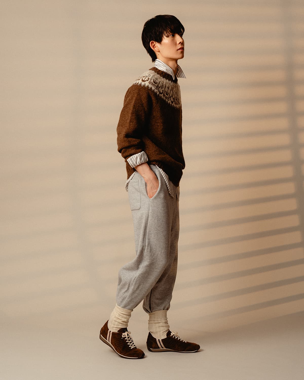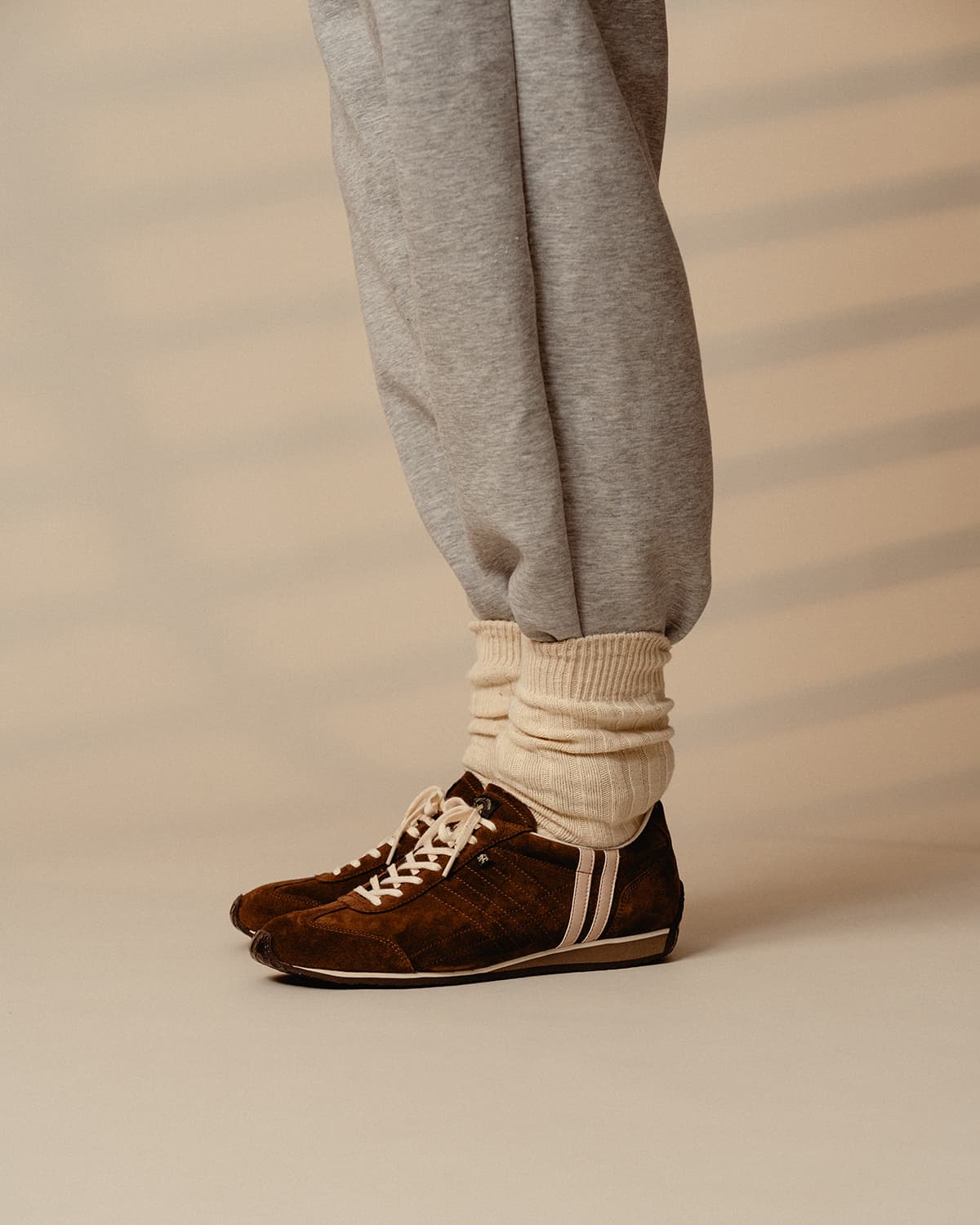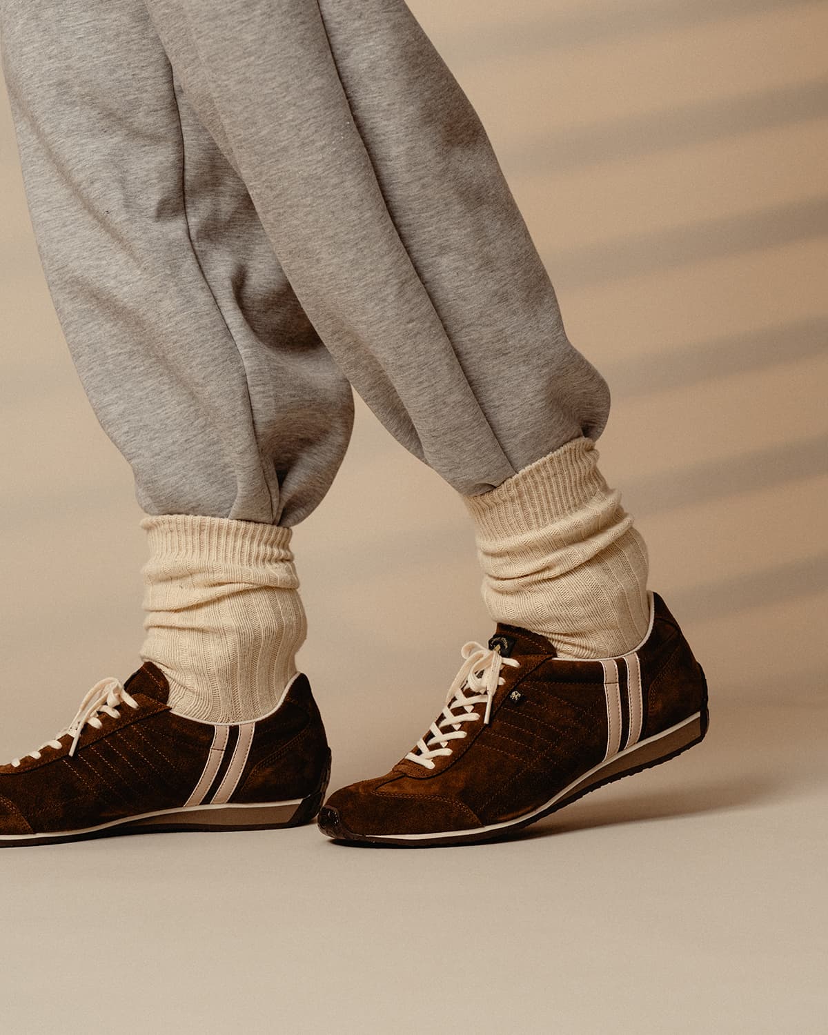 深いブラウンはウールパンツやジャケットスタイルにもすんなり溶け込みます。スニーカーでありながら品を添える、オン・オフ対応の一足です。