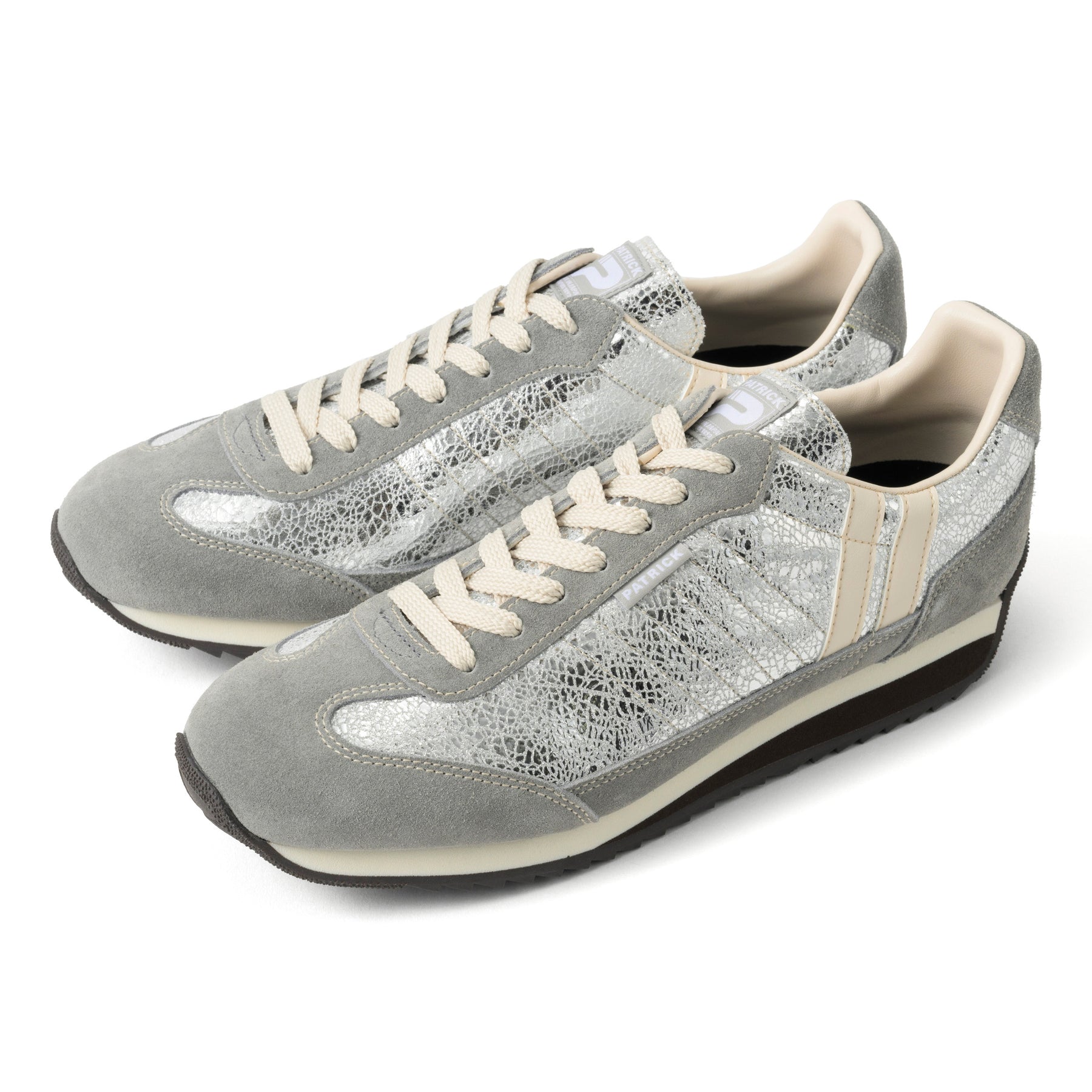 定番モデル「MARATHON」の素材を刷新し、斬新な魅力を加えたのがMARACK-LE(マラック・レザー)です。このモデルは、アッパーにクラッキング加工を施したメタリックフィルム付きのステアレザーを使用している点が最大の特徴。