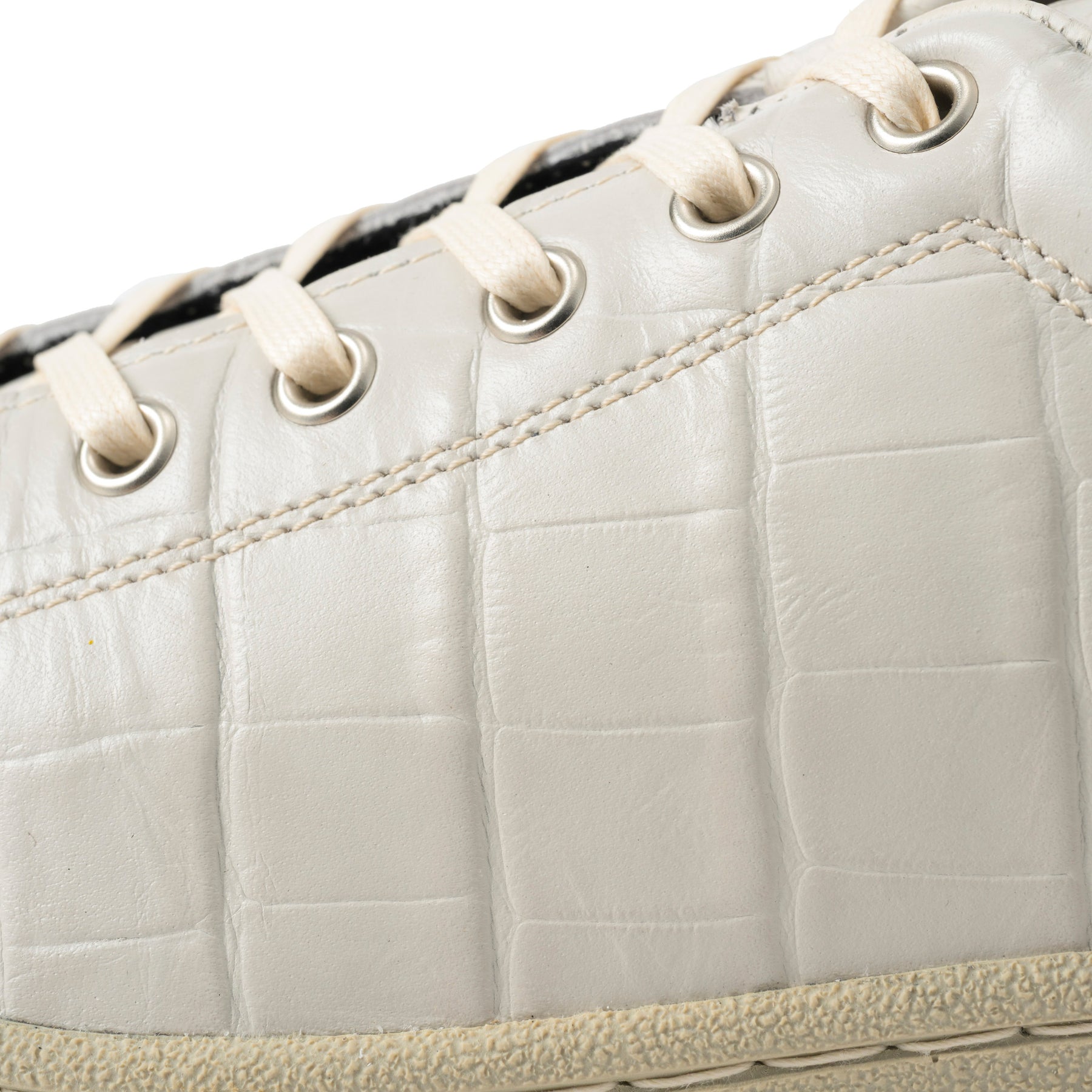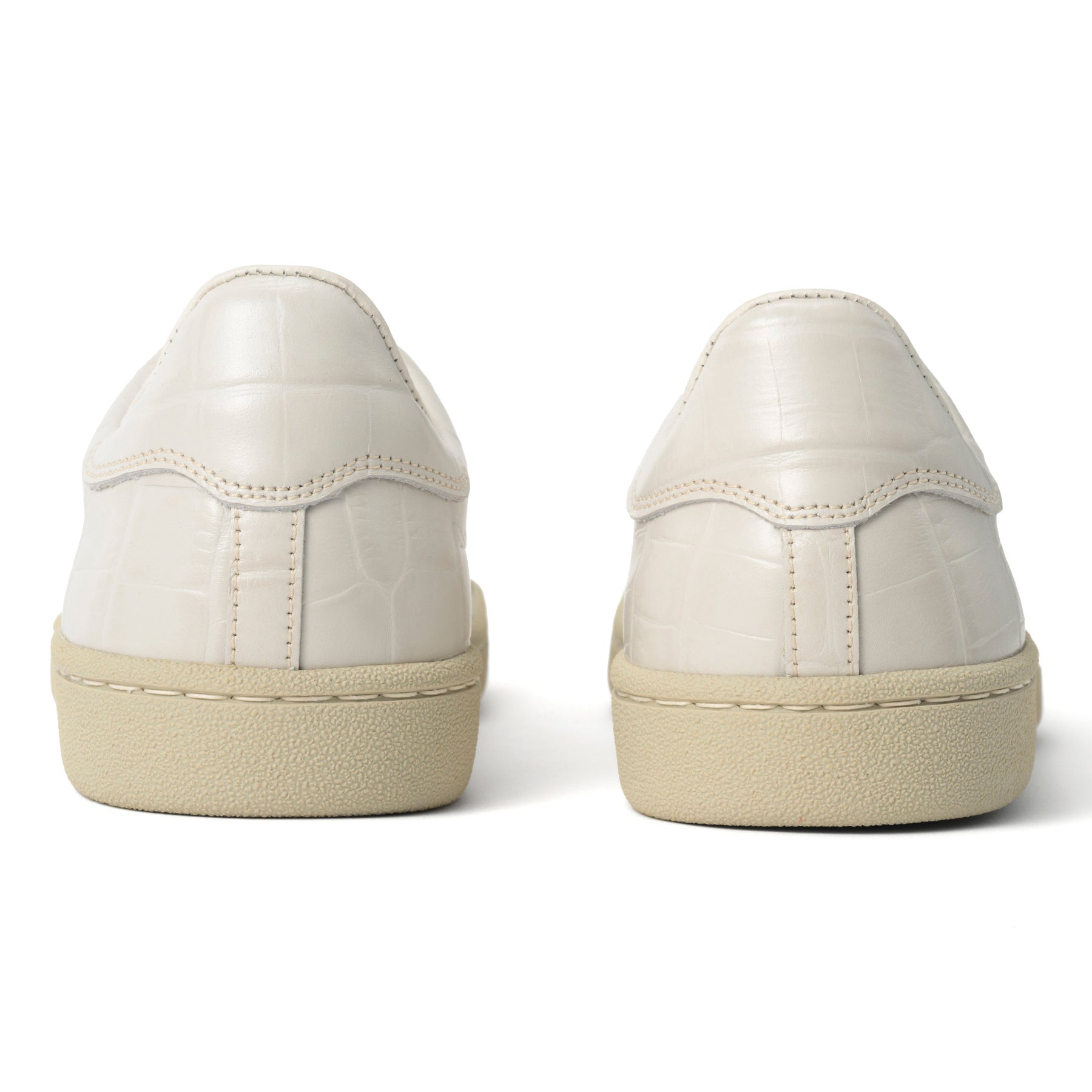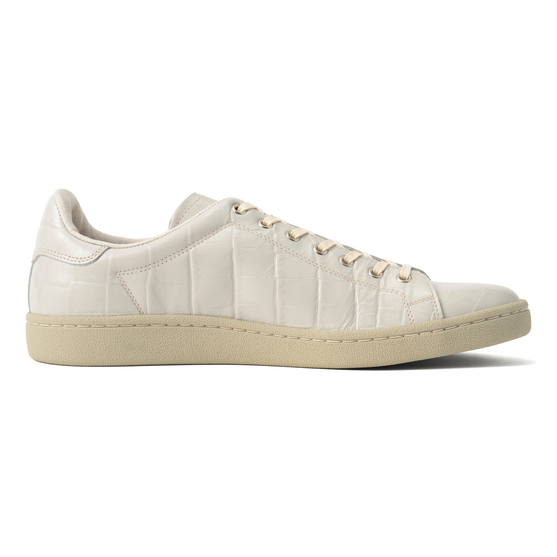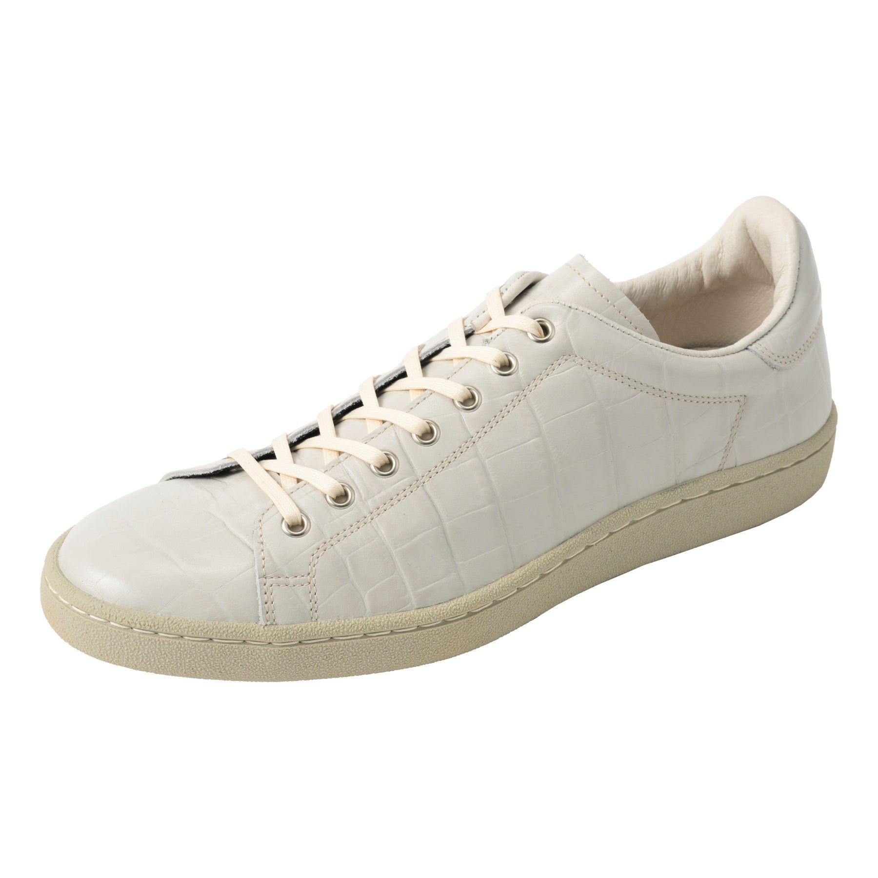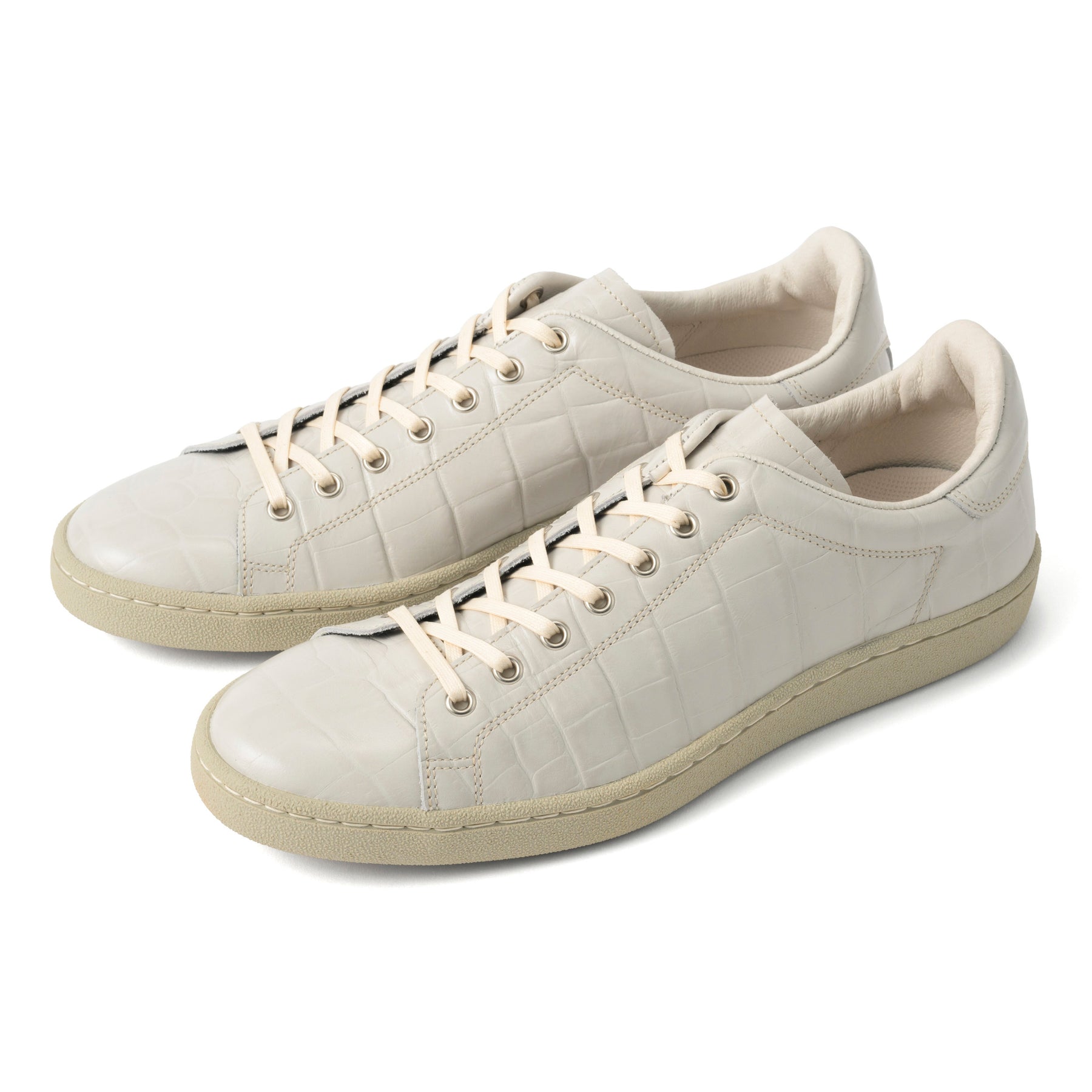 特にGRY(グレー)カラーは、職人が一つひとつ丁寧に手染めを施すことで、絶妙なツートンカラーに仕上げられています。これにより、クロコ型押しの凹凸が強調され、立体感のある表情が生まれています。一見シンプルなグレーでありながらも、見る角度によって表情を変える奥深さは、まさに大人のためのスニーカーと言えるでしょう。