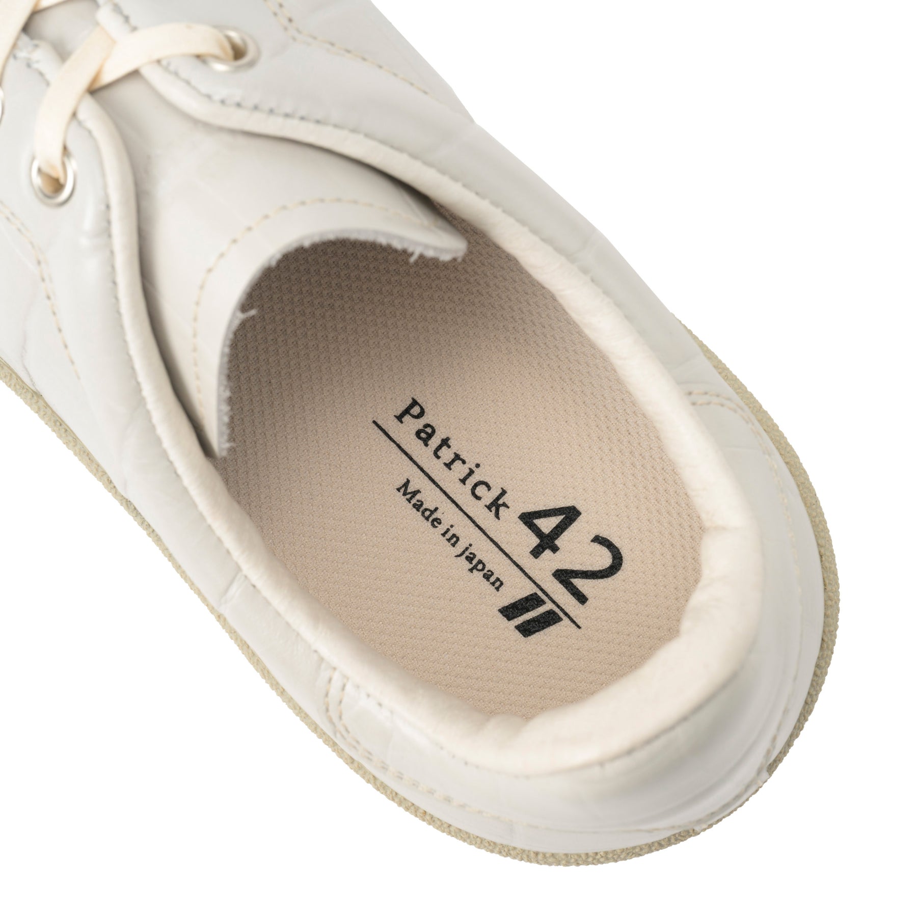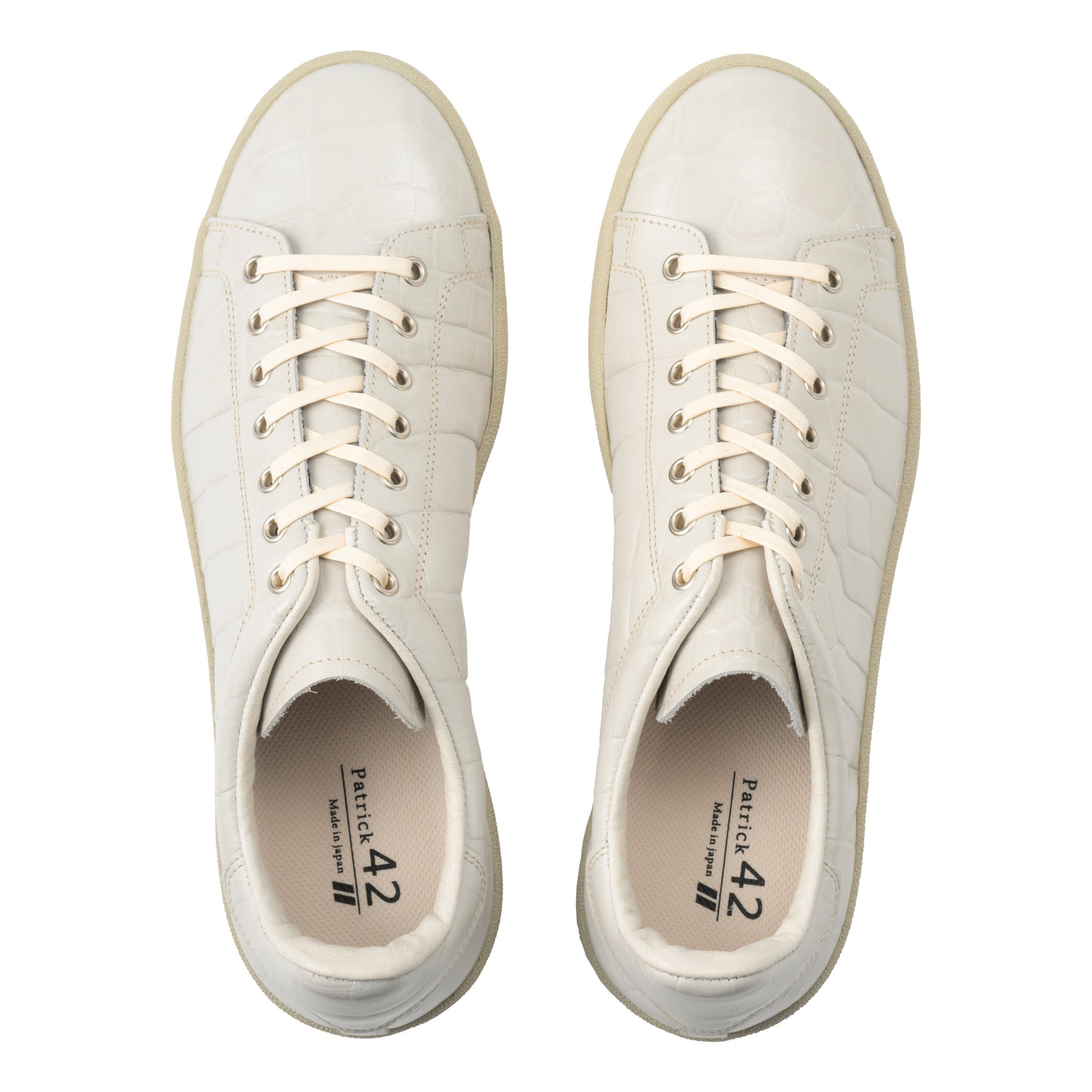 このモデルの最大の特徴は、アッパー全体に施された大きめのクロコ型押しです。素材にはステアレザーを使用しており、リアルなクロコダイルの質感を再現しつつも、手入れのしやすい実用性を兼ね備えています。