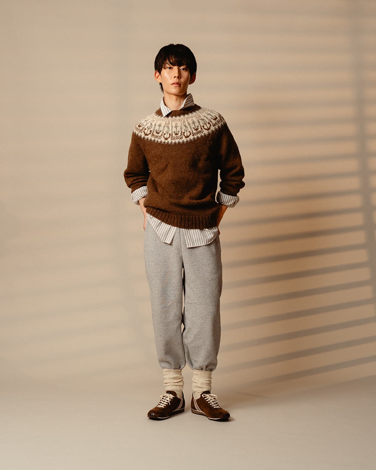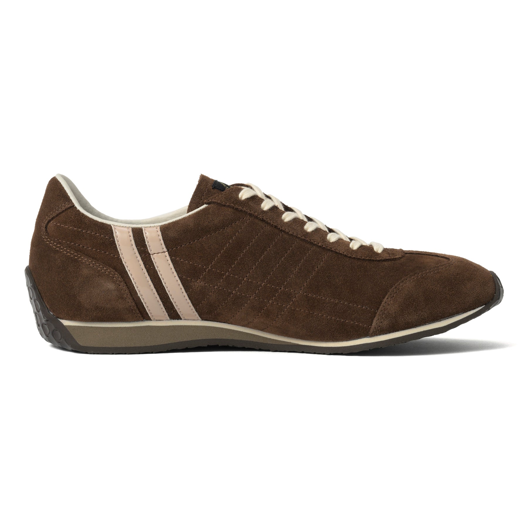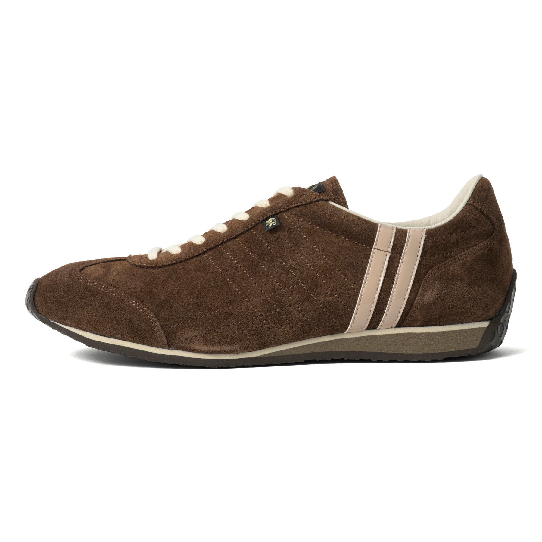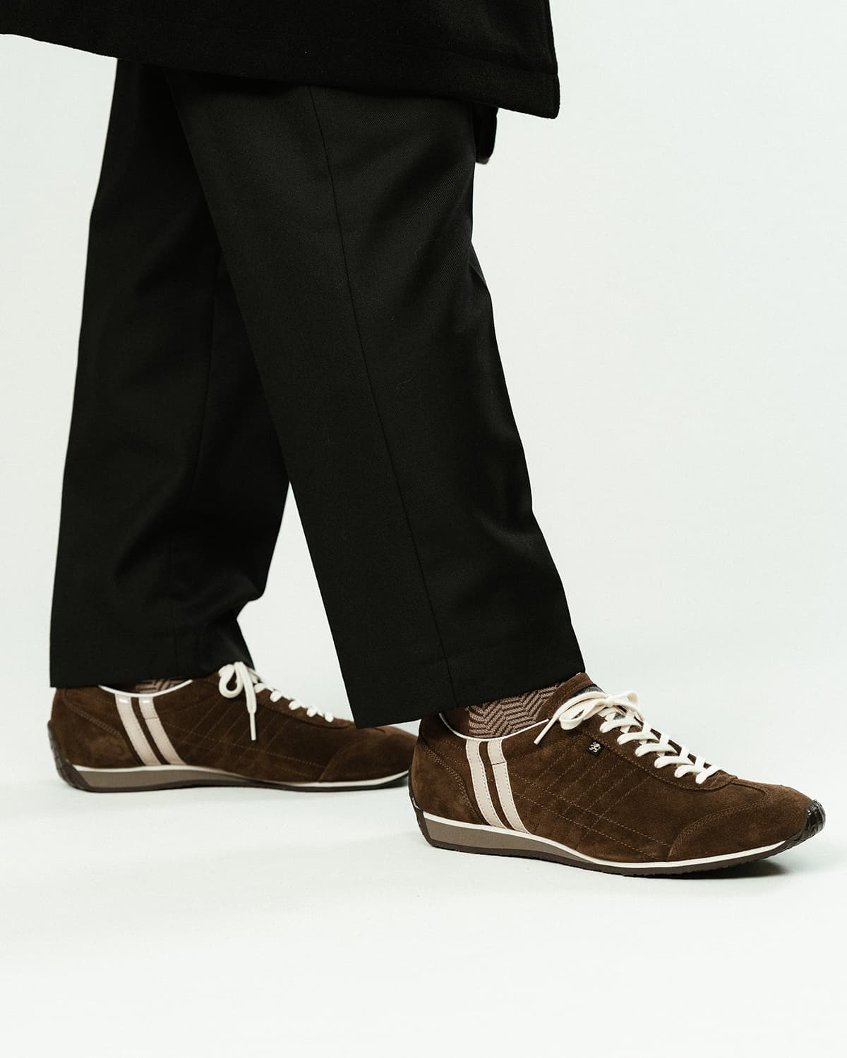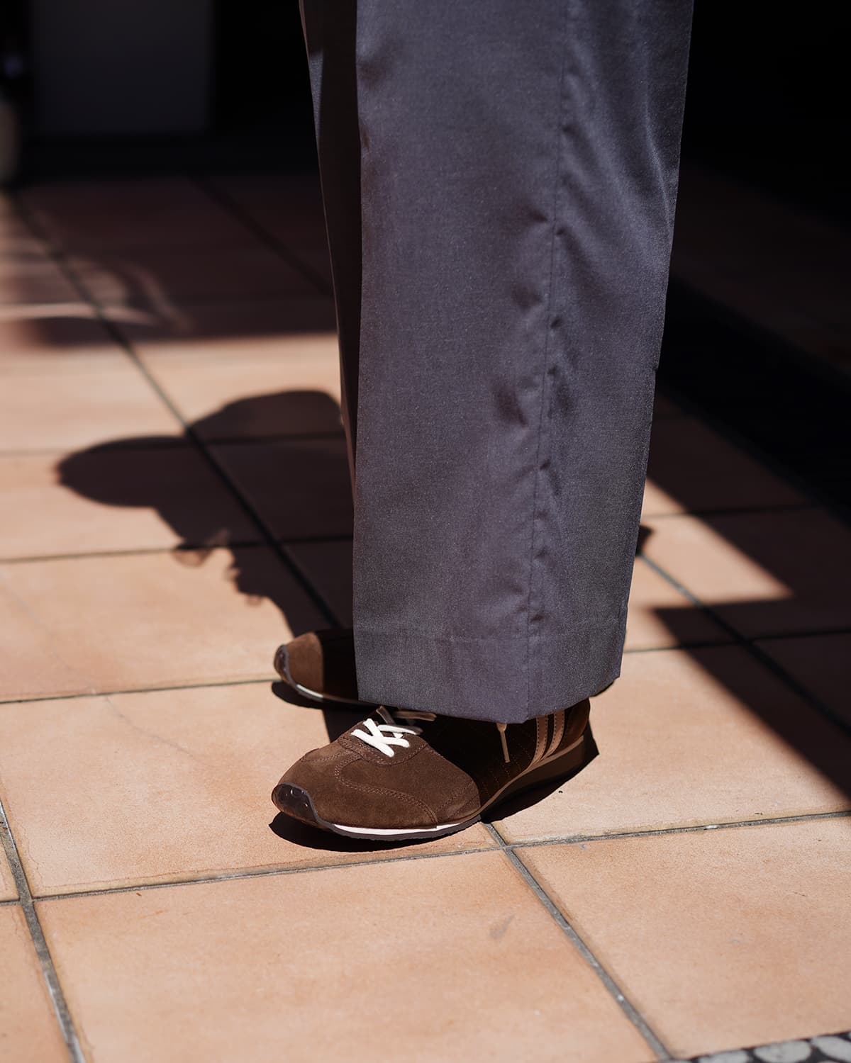 深いブラウンはウールパンツやジャケットスタイルにもすんなり溶け込みます。スニーカーでありながら品を添える、オン・オフ対応の一足です。