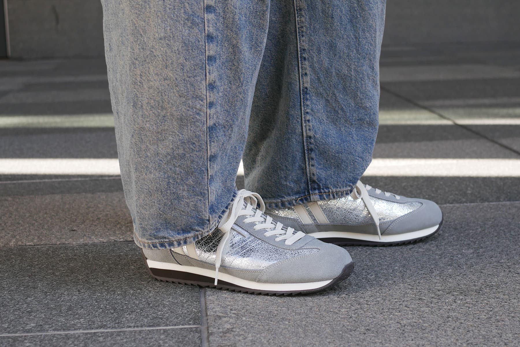 デニムやカーゴでラフに、スラックスで外すのもおすすめ。メタリックのニュアンスがスタイリングに奥行きを加え、シンプルな装いでも足元が決まります。派手すぎない存在感なので、デイリーにも取り入れやすい一足です。