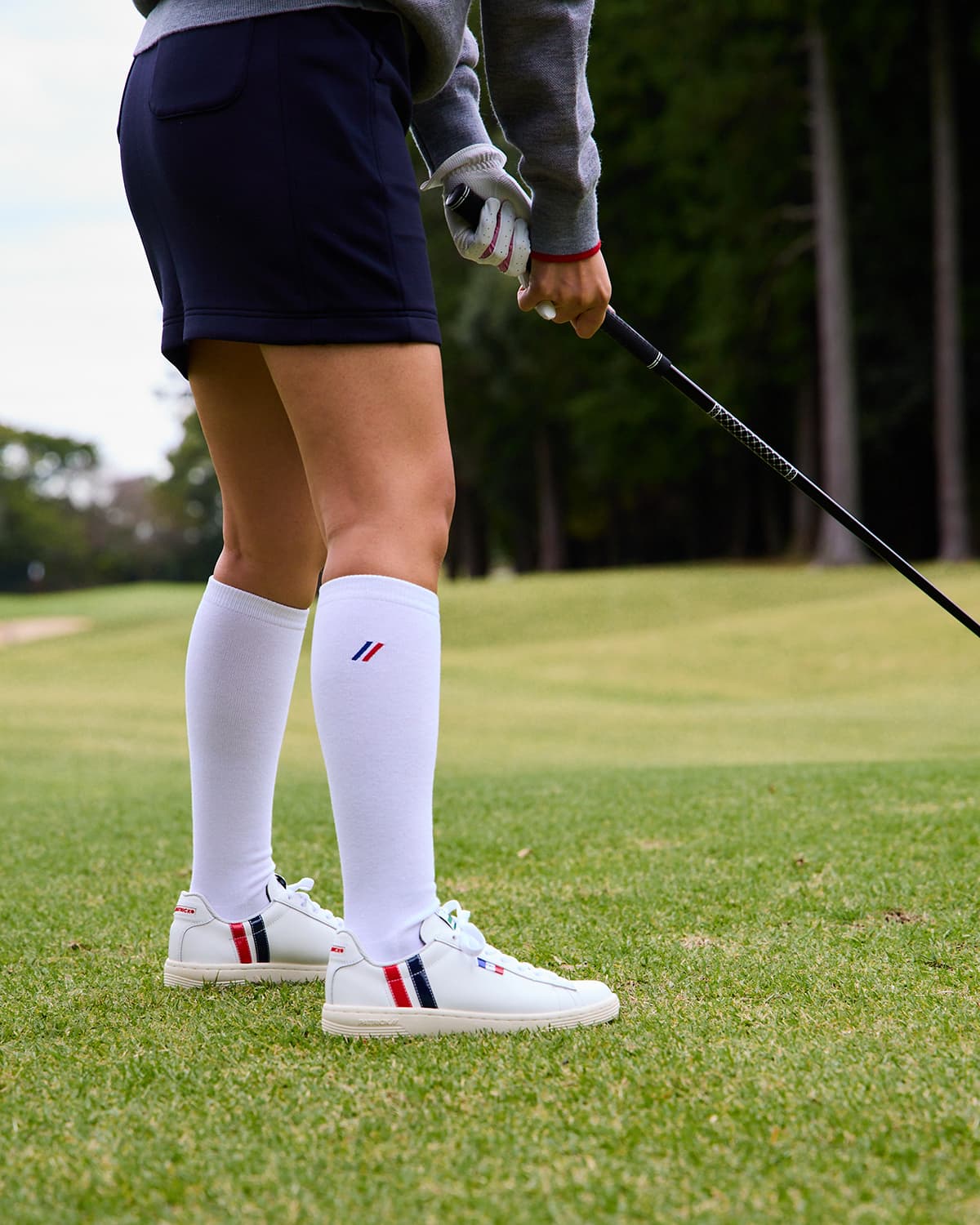 トレンドのコート系スタイルに、踵部分の鮮やかなエナメル2本ラインがアクセント。トリコロールのピスネーム付きハトメや、GOLF専用の新しいPOPな織ネームが高級感と遊び心を演出します。