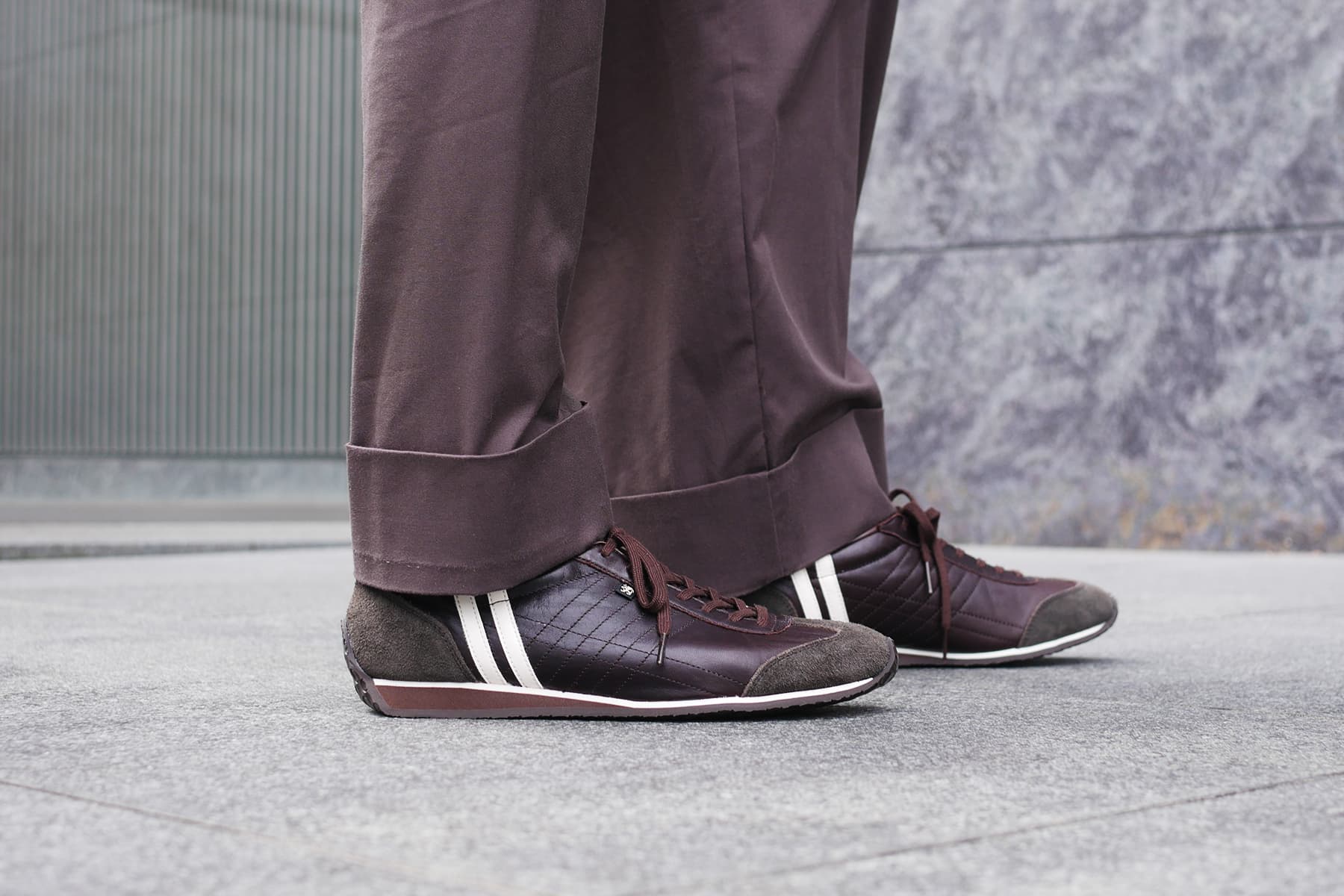 今回のシーズンカラーは、濃厚なチョコブラウン。ホースレザーの上品な光沢と相まって、しっとりとした存在感を放ちます。重たくなりがちな色味も、白い2ラインとソールが抜け感を演出し、都会的な軽さを添えています。
