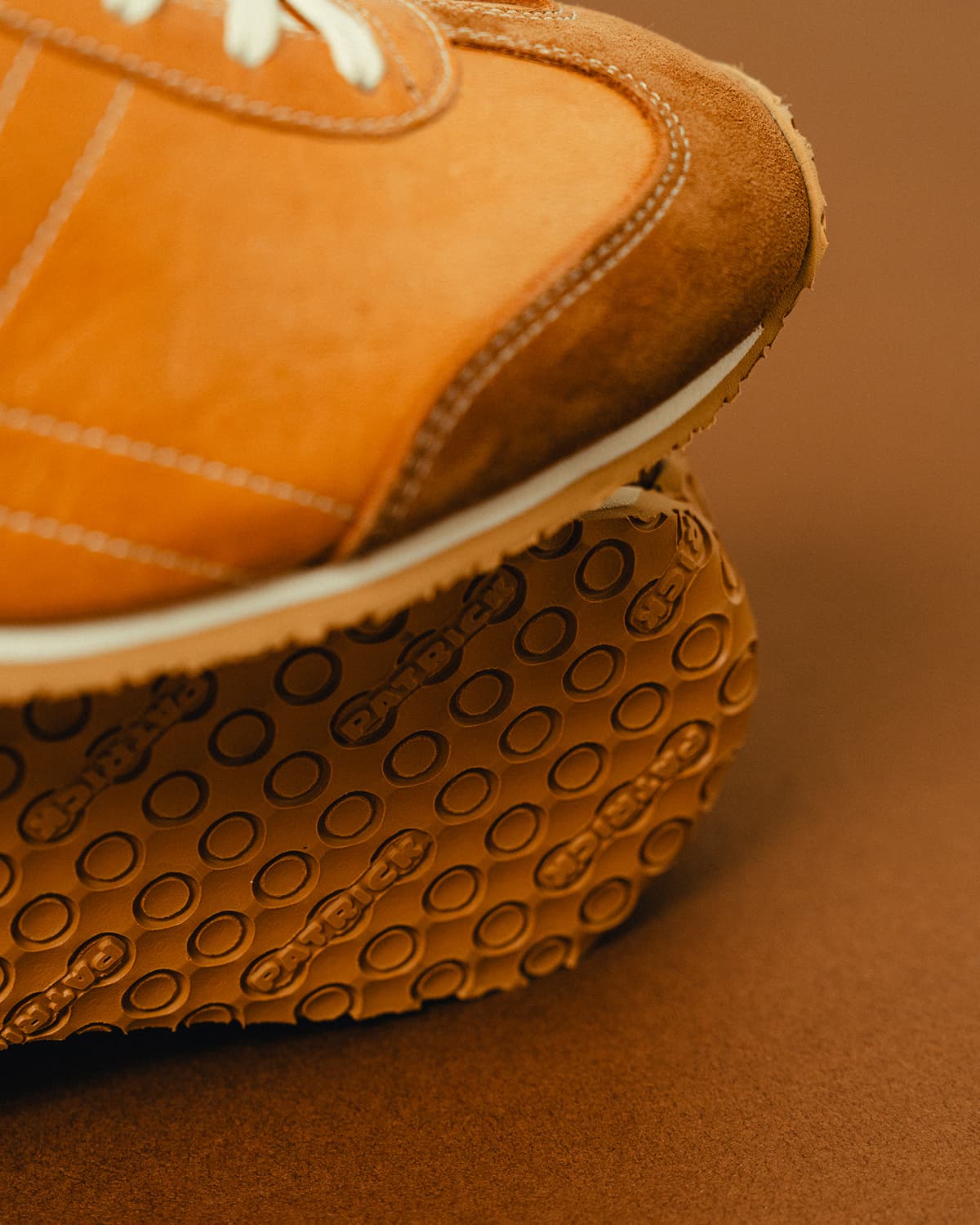 ソールには軽量発泡素材を採用。クッション性と耐久性を両立し、長時間の歩行でも軽快な足取りをキープ。見た目のスマートさとは裏腹に、驚くほどの快適さを感じられます。