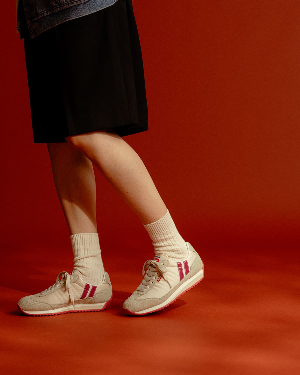 パトリックらしさ全開のカラー。白の清涼感に、桃のような赤ピンクが絶妙なアクセント。足元から気分が上がる、“フルーツゼリー”をテーマカラーにした復刻カラーです。ベーシックなフォルムだから、色が映える。
