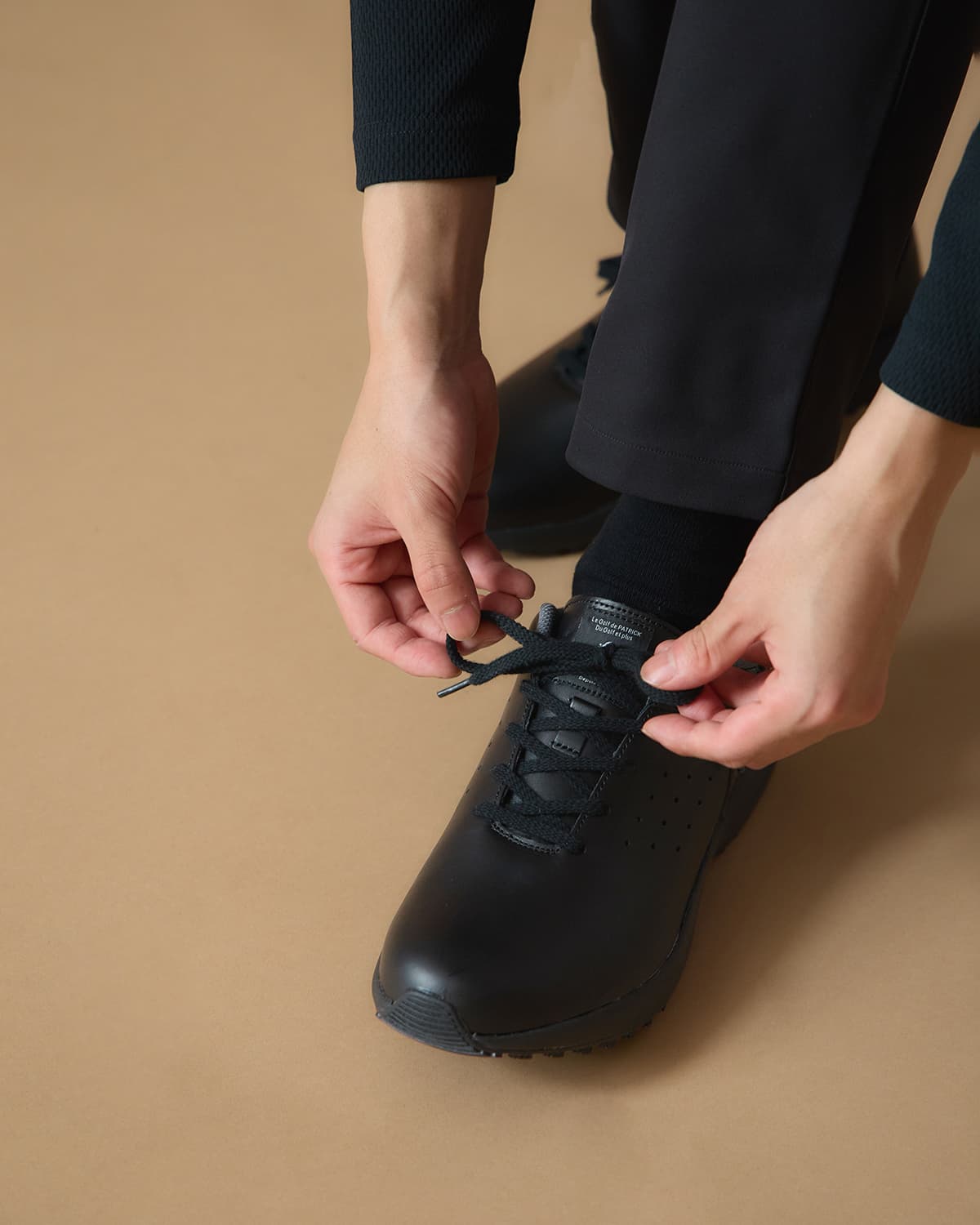 定番モデル「シャトー・カップ レザー」をベースにした、洗練のオールブラックバージョン。 全身のスタイリングを引き締めるだけでなく、サイドの2本ラインをエナメル素材に切り替えることで、黒スニーカーにありがちな重たさを抑え、汎用性の高い上質な印象に仕上げています。