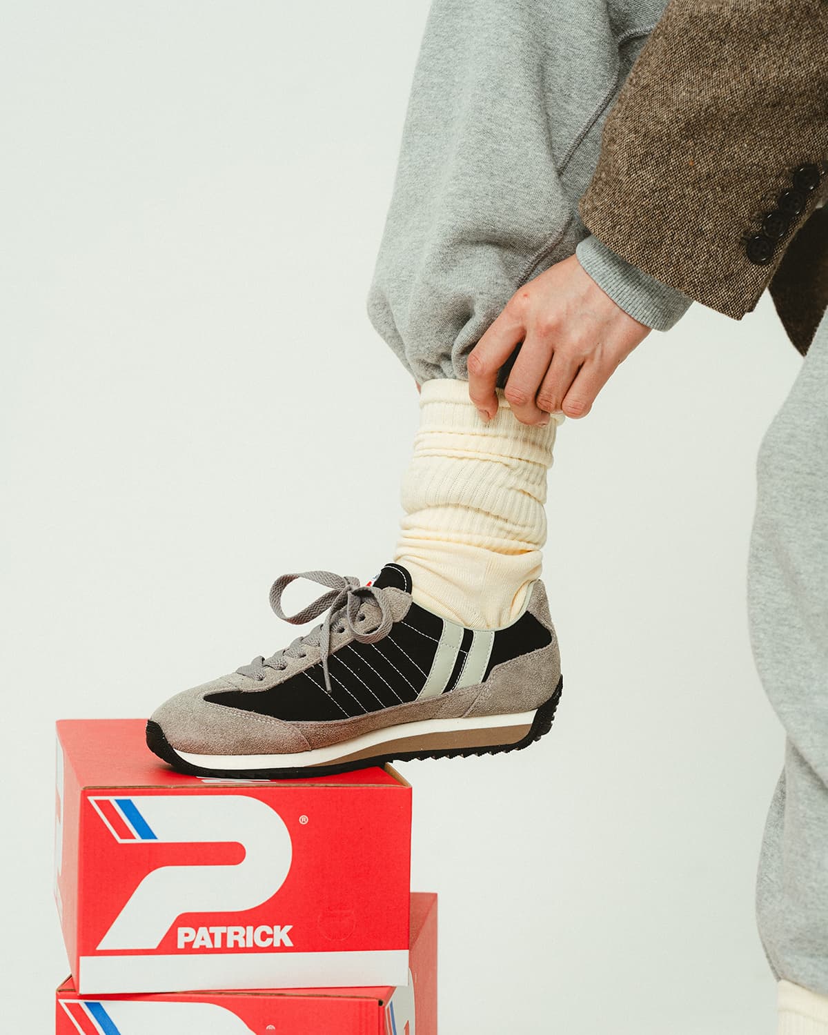 数量限定の“PEPPER”は、グレーベロアとブラックナイロンを掛け合わせた大人の二層構造。控えめなのに足元が締まるカラーリングで、MARATHONらしい“朝の清々しさ”をさりげなく演出します。