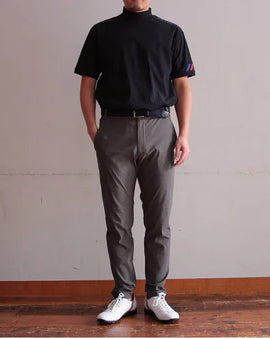 着こなしについて、このメンズストレッチモックネックは、上下セットアップでの着用がスタイリッシュな印象を与えます。他にも、ショートパンツやテーパードパンツ、スラックスなど、様々なボトムスとの相性が良く、カジュアルなゴルフスタイルを楽しむことができます。シンプルながらもデザイン性があり、日常のカジュアルスタイルにも違和感なく取り入れられます。