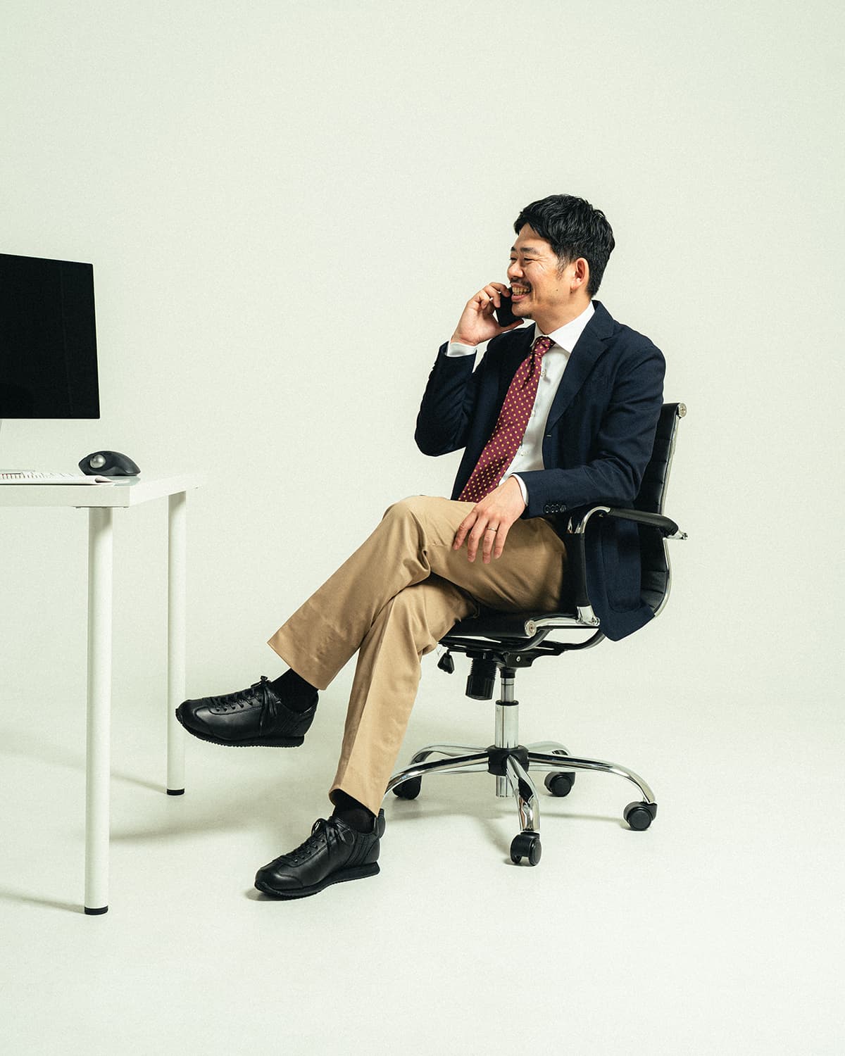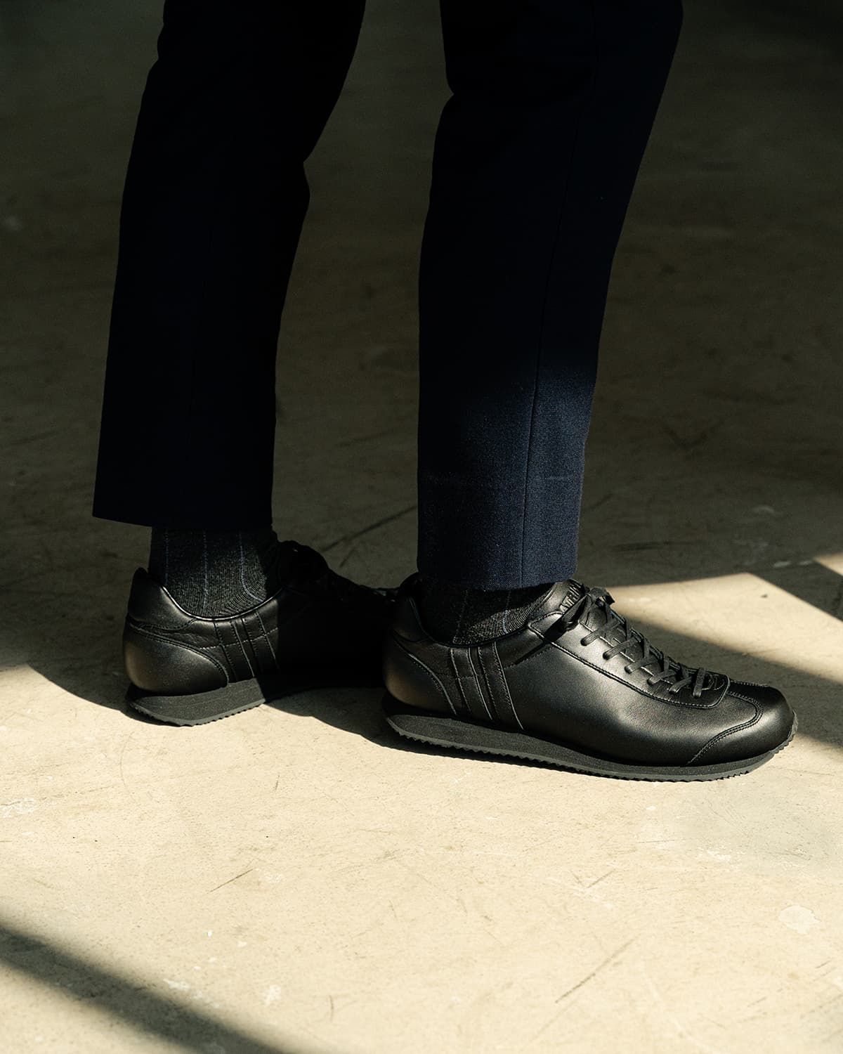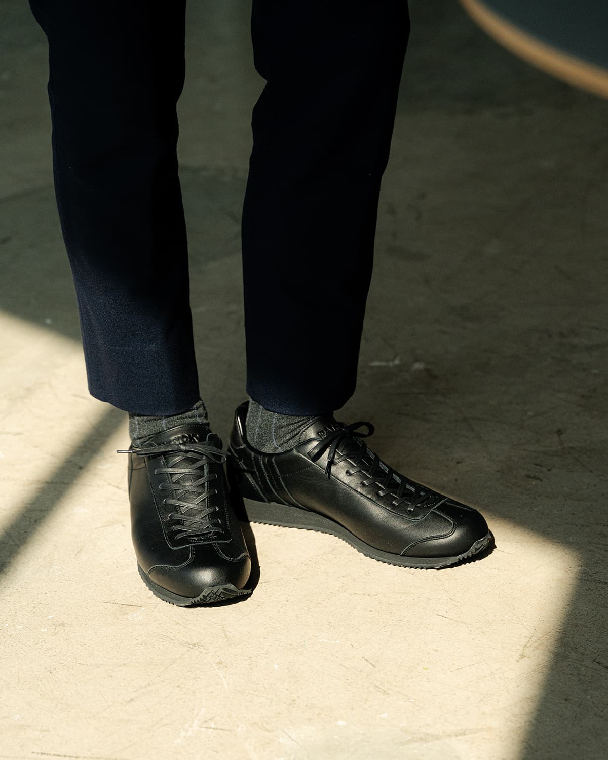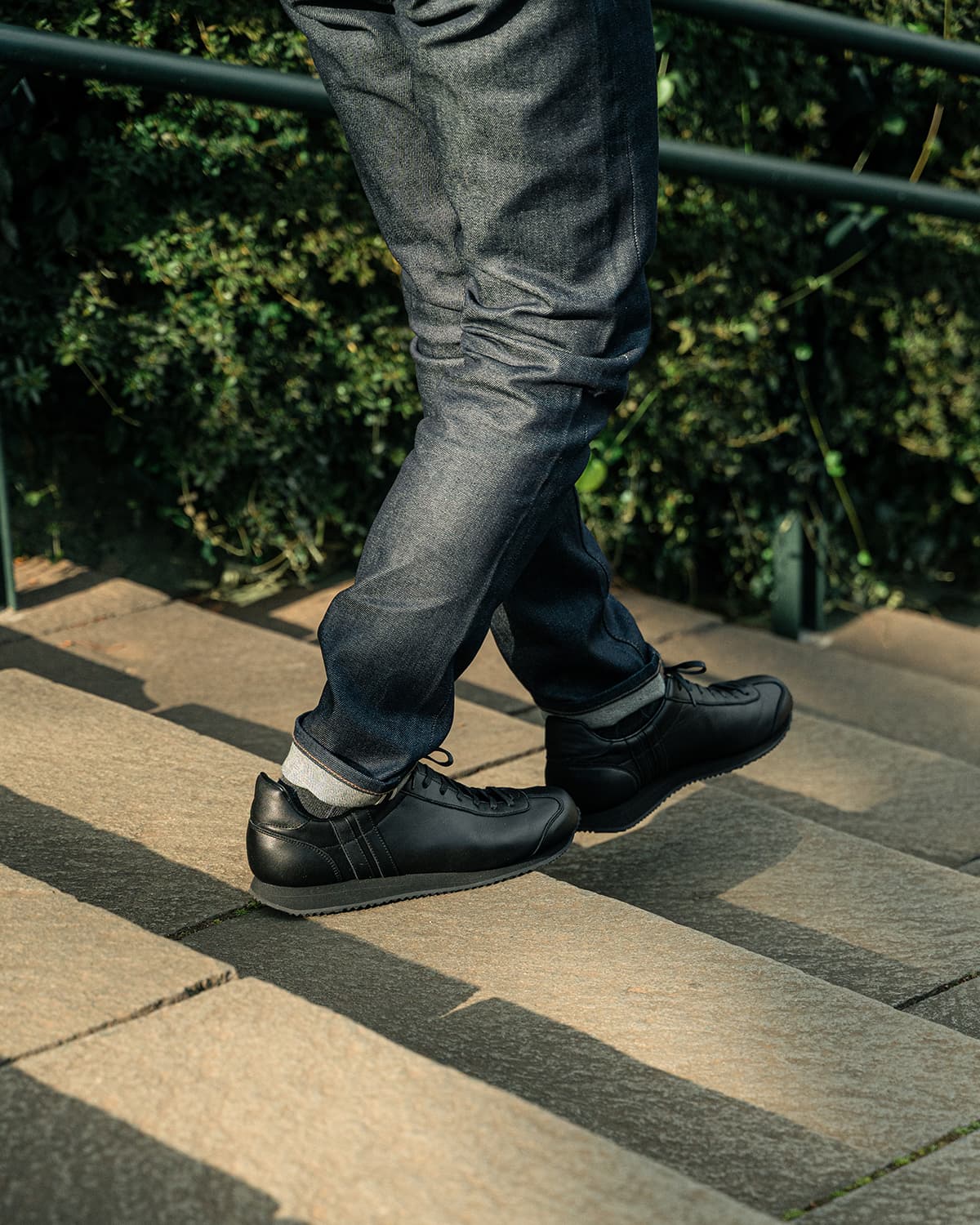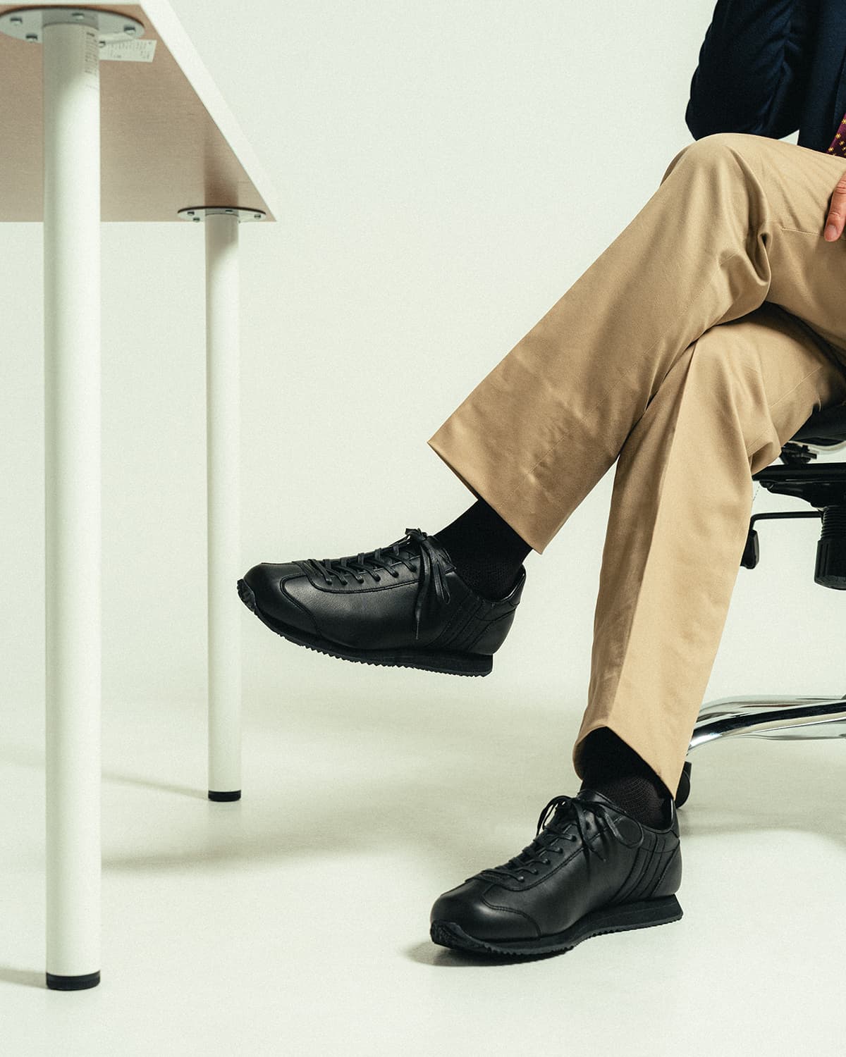 オールブラックの落ち着いたデザインは、ビジネスシーンでも違和感なく着用可能。スーツスタイルに合わせれば、上品な足元を演出しつつ、スニーカーならではの快適な履き心地を提供します。また、カジュアルなコーディネートにも馴染み、デニムやチノパンとの相性も抜群。オンオフ問わず、スタイリッシュに履きこなせる万能な一足です。