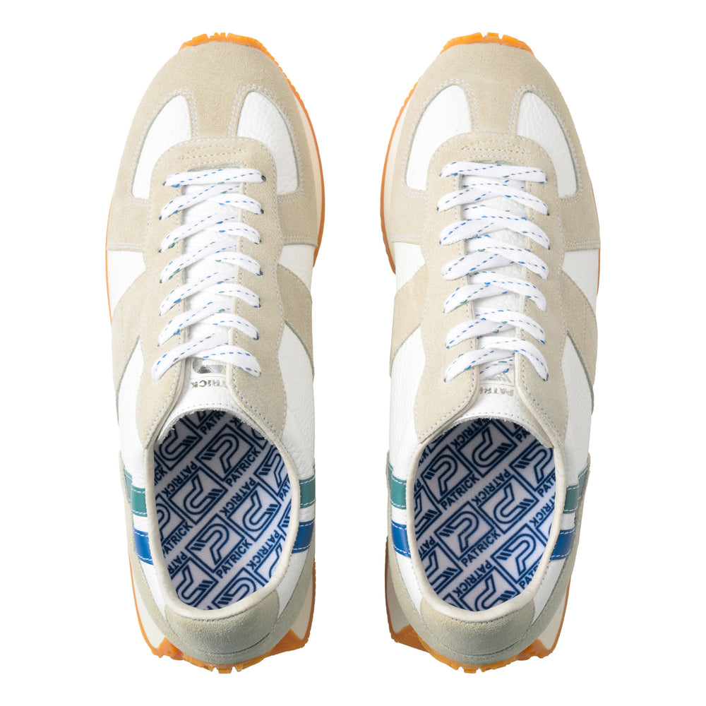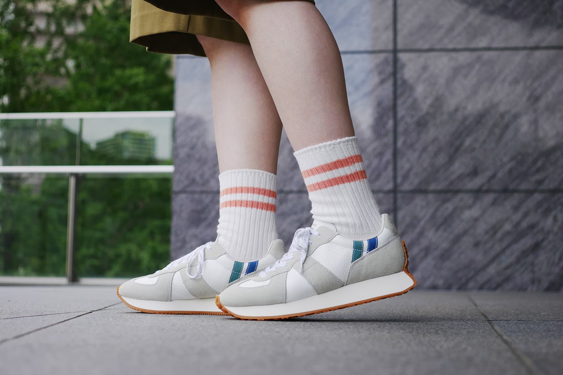 このモデルは、「MARATHON」、「JALOR」、「IRIS」の3モデルパック提案で、アッパーにはシボが均一に入り、ふっくらとした足当たりの良いスムースレザーを採用しています。また、2本ラインのレザーとコットンベースのシューレースに使用したブルーとグリーンがアクセントとなり、爽やかな印象を与えます。