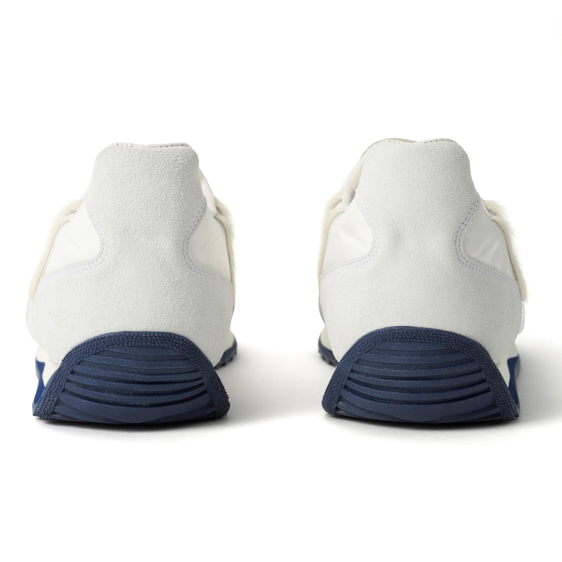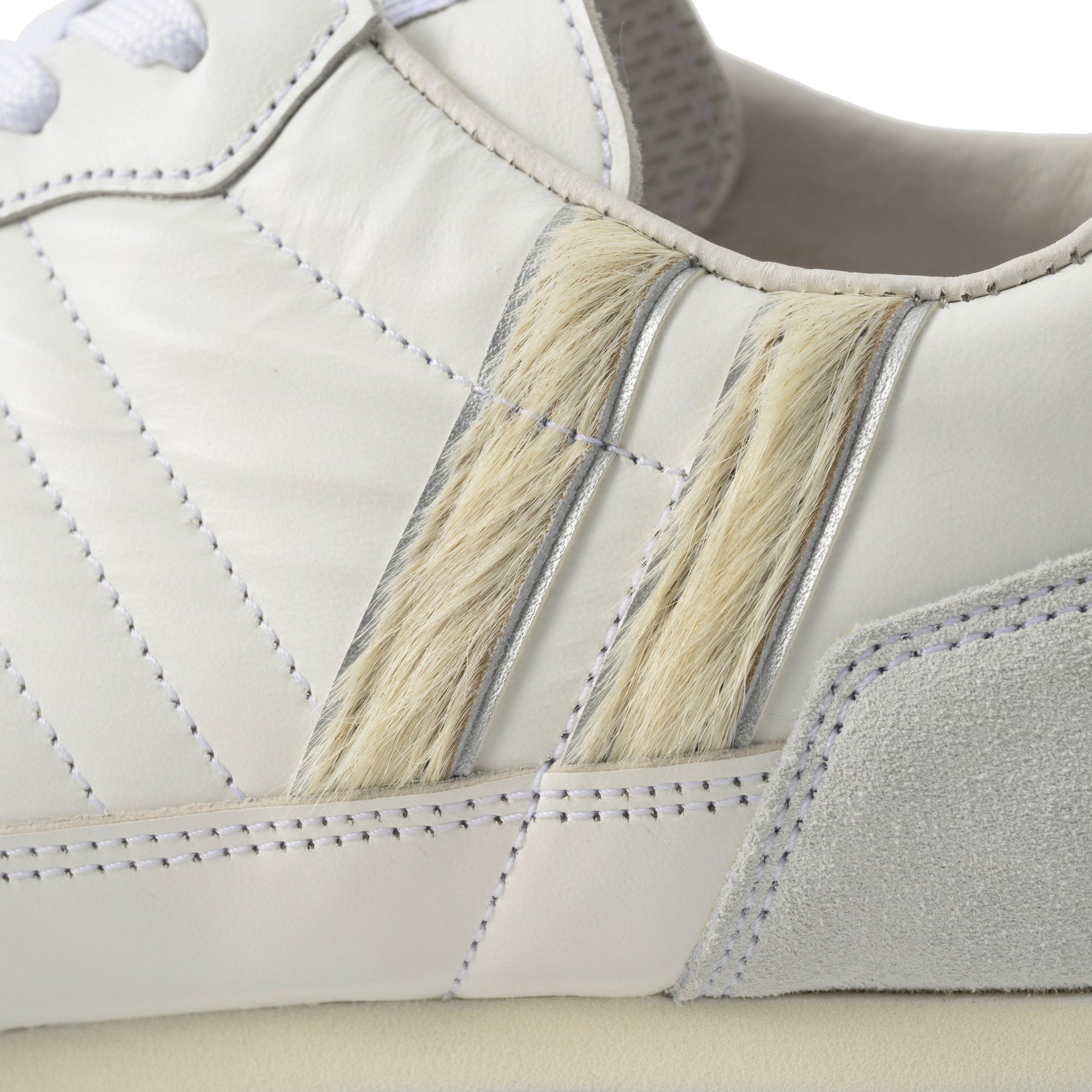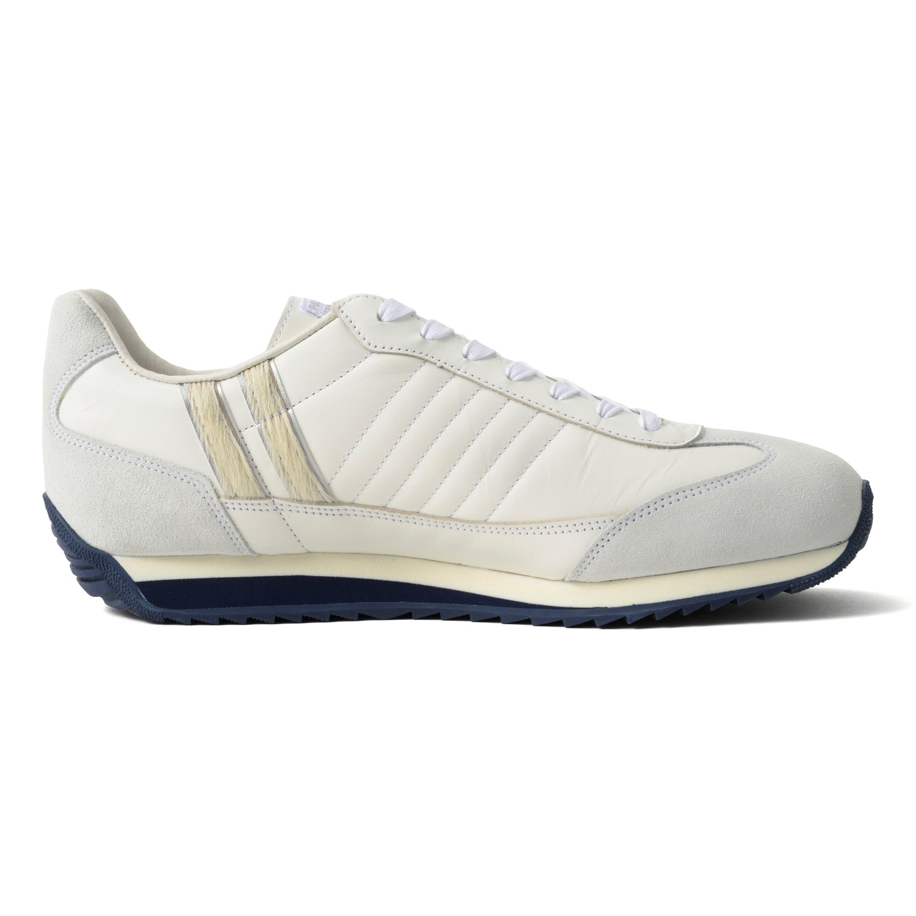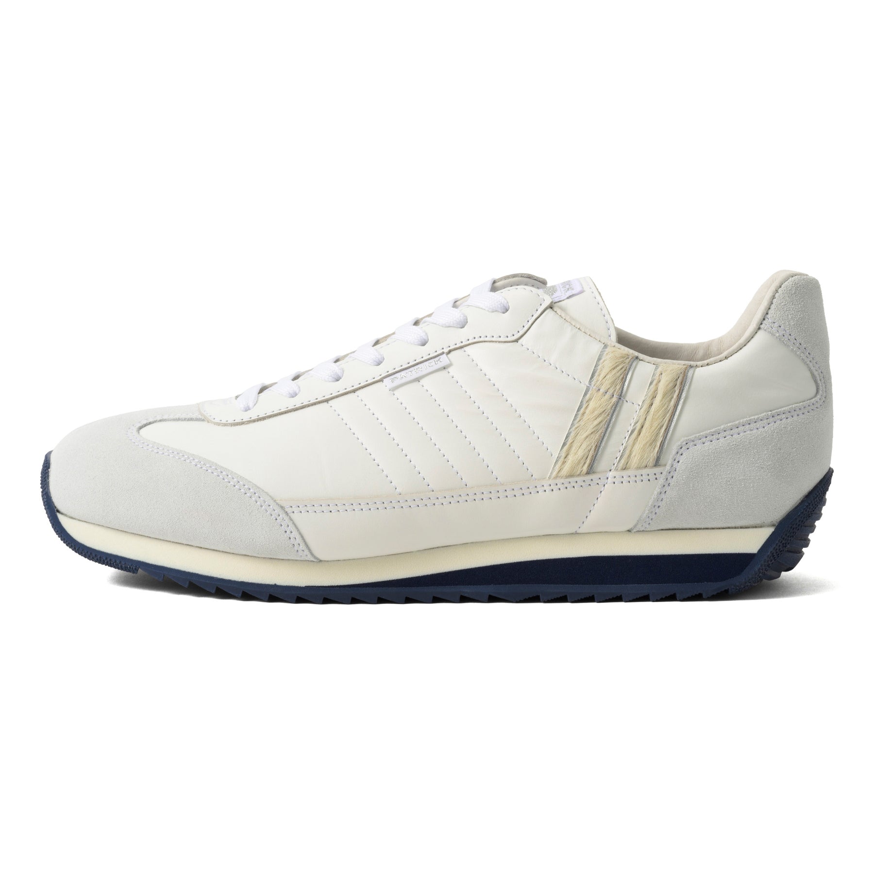 白馬をイメージしたクリーンなホワイトに、シルバーで縁取った2ラインがさりげなく主張。毛付きレザーのラインがアクセントになり、静かに速そうな雰囲気を漂わせます。