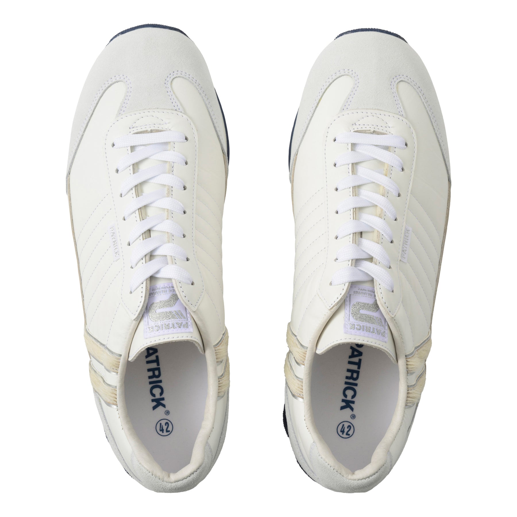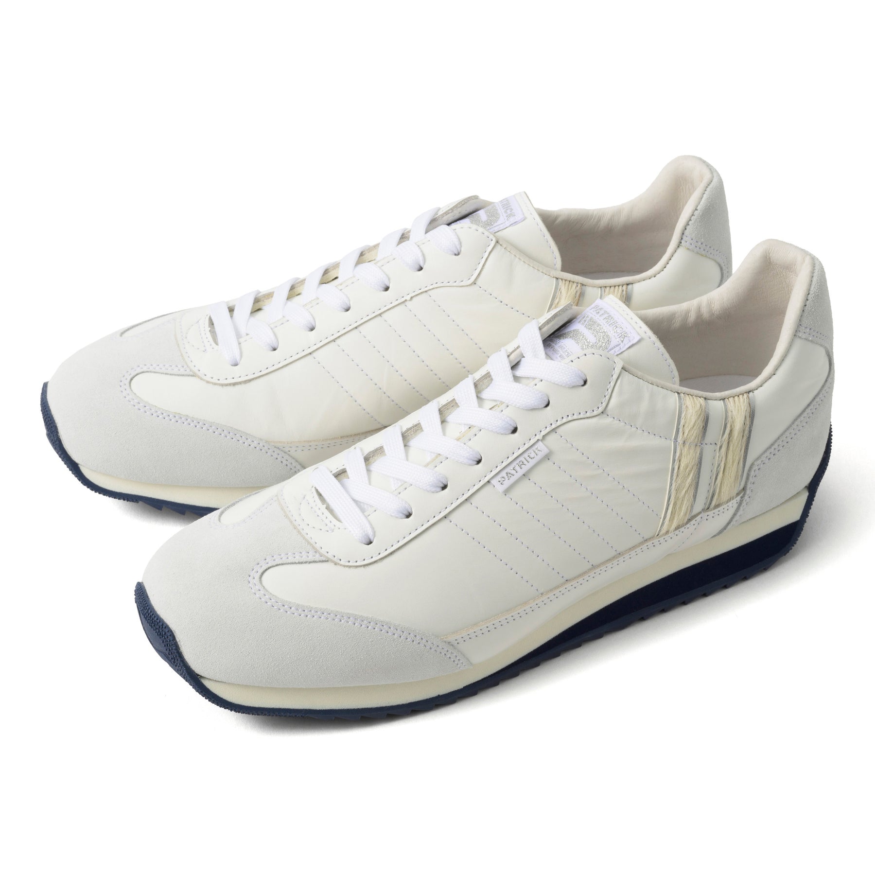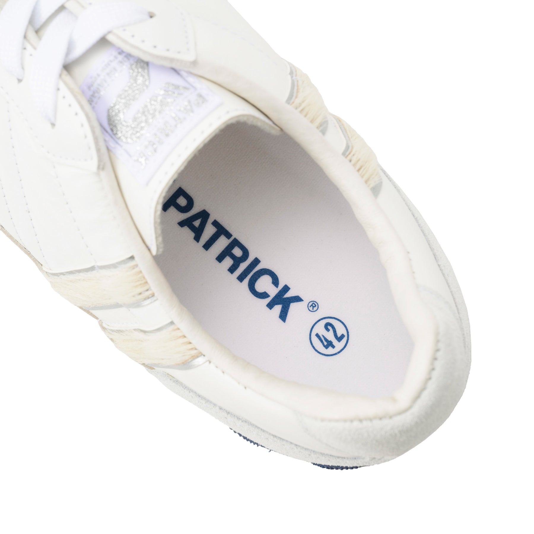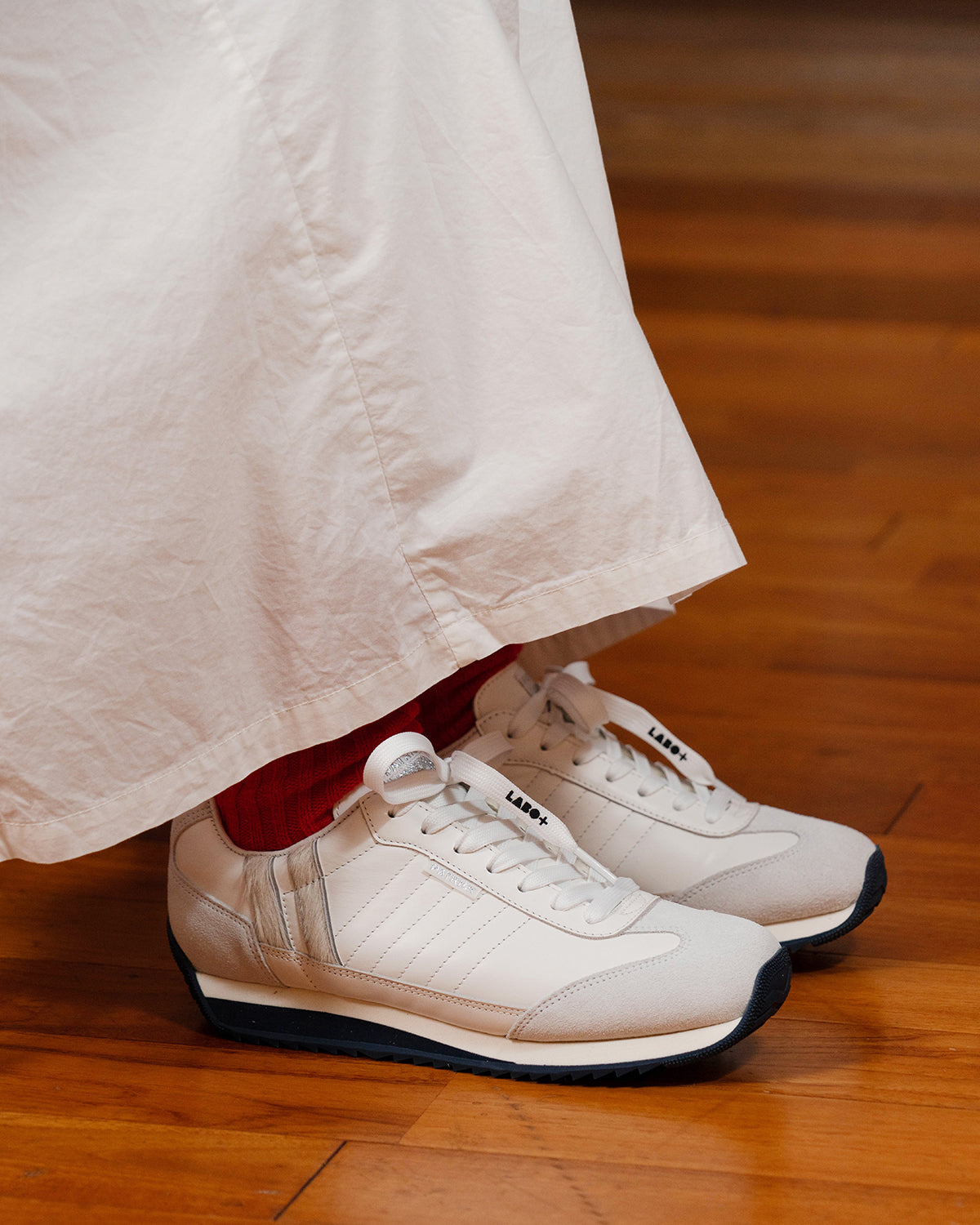 白馬をイメージしたクリーンなホワイトに、シルバーで縁取った2ラインがさりげなく主張。毛付きレザーのラインがアクセントになり、静かに速そうな雰囲気を漂わせます。