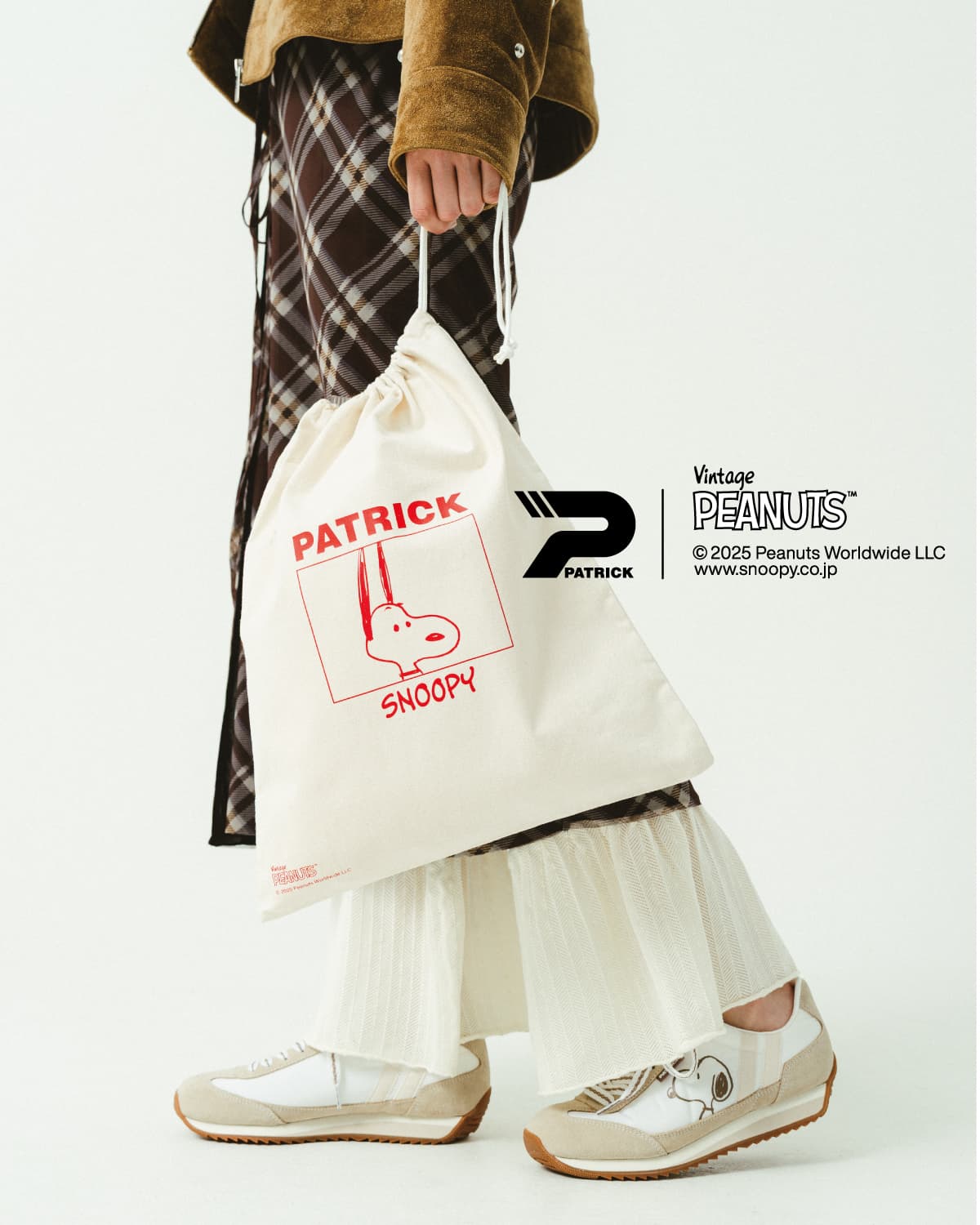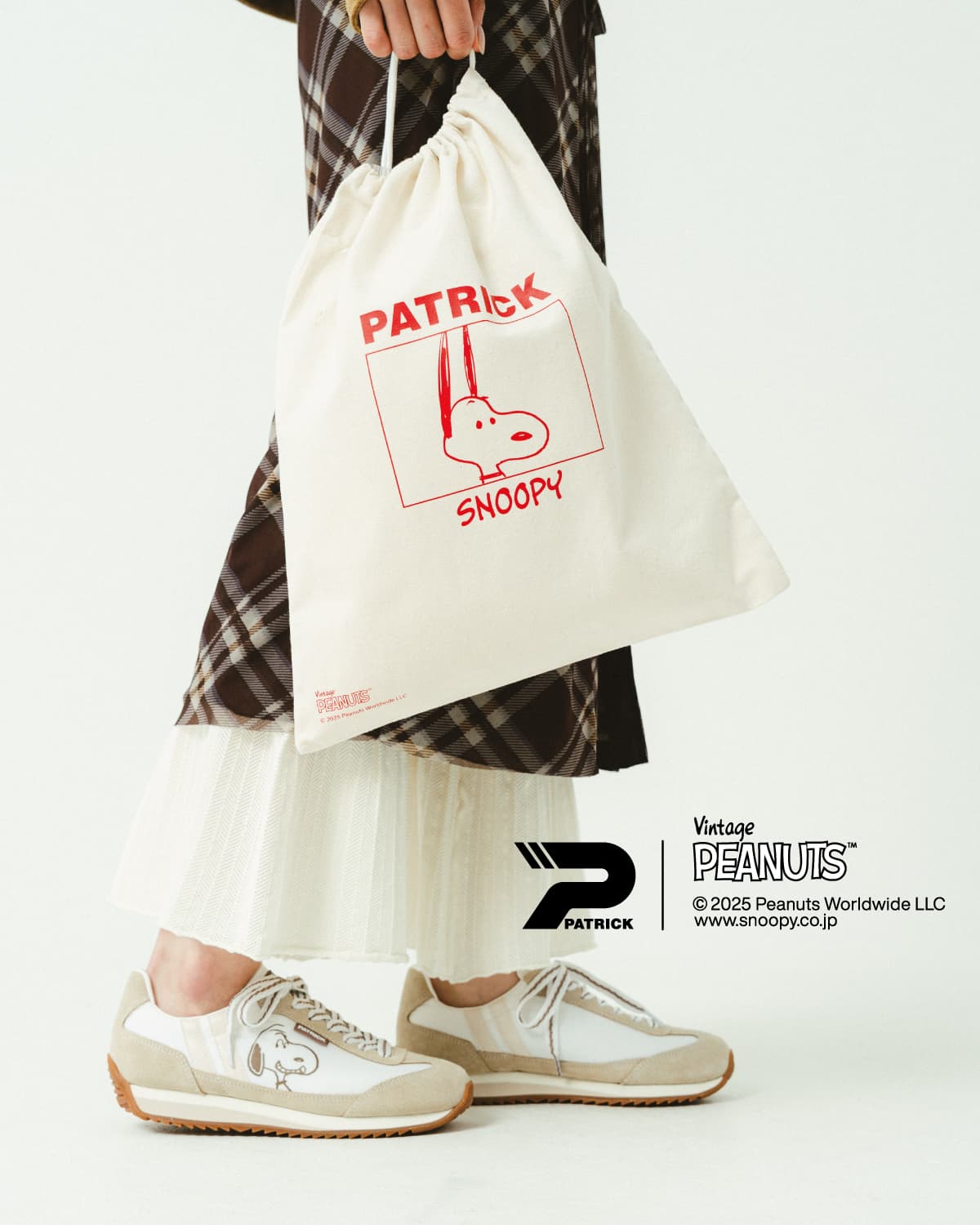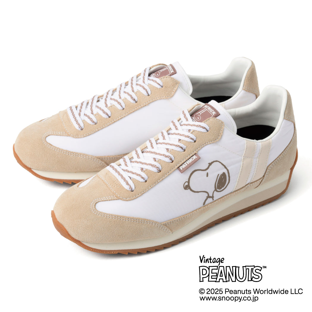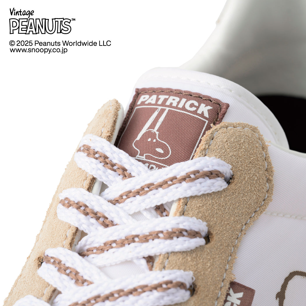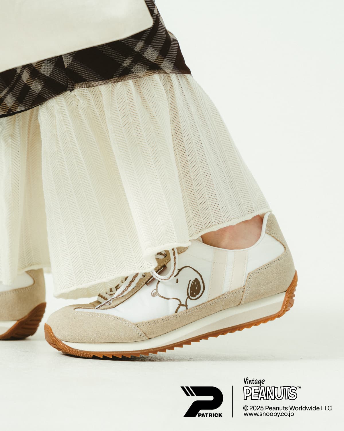 「マラソン」モデルをベースに、スヌーピーの愛らしい表情を左右の外側にプリントしています。シュータンネームには、スヌーピーの耳を立ち上げたデザインを施し、まるでパトリックの象徴である2本ラインのようなアートを表現。シューレースにはギザギザ模様の入ったデザインを採用し、PEANUTSの世界観を細部まで楽しめる仕上がりになっています。
