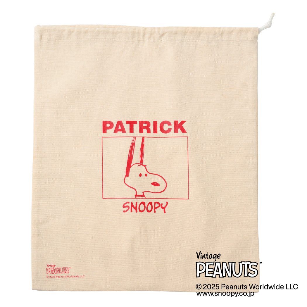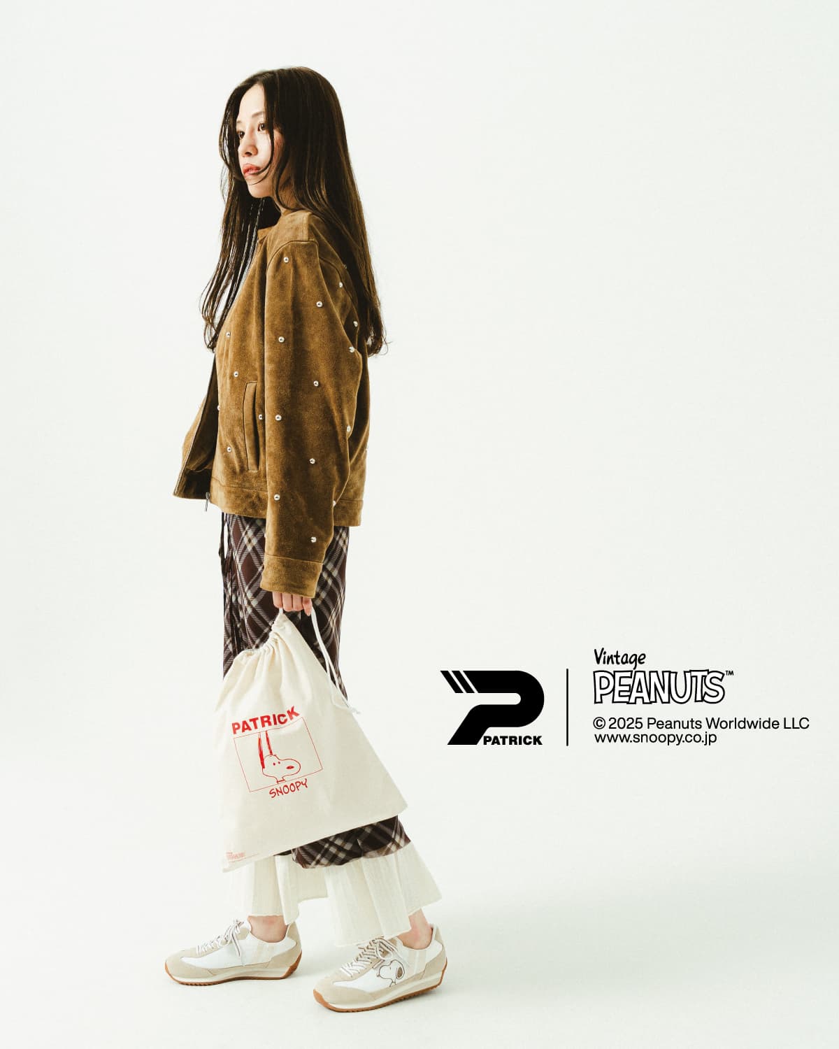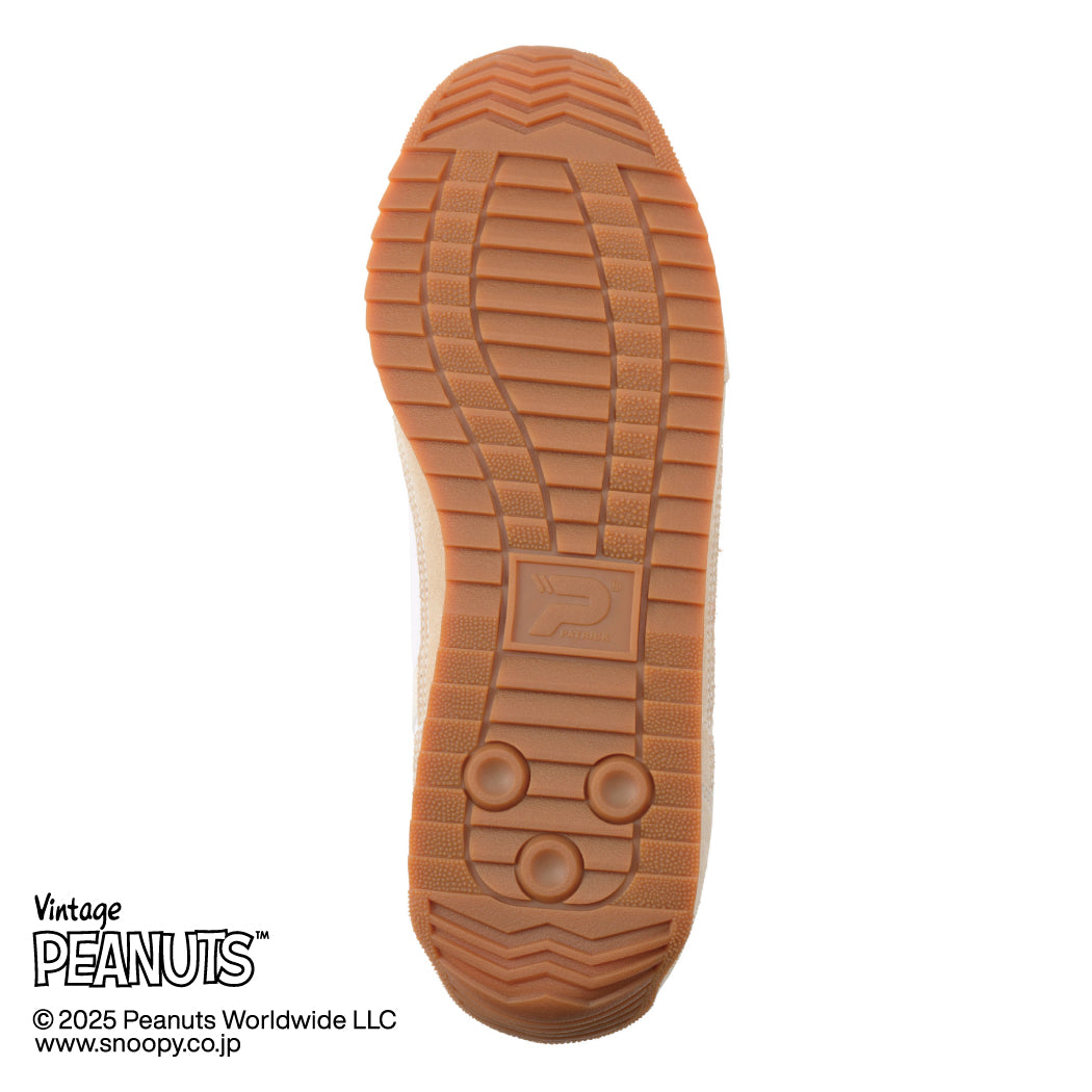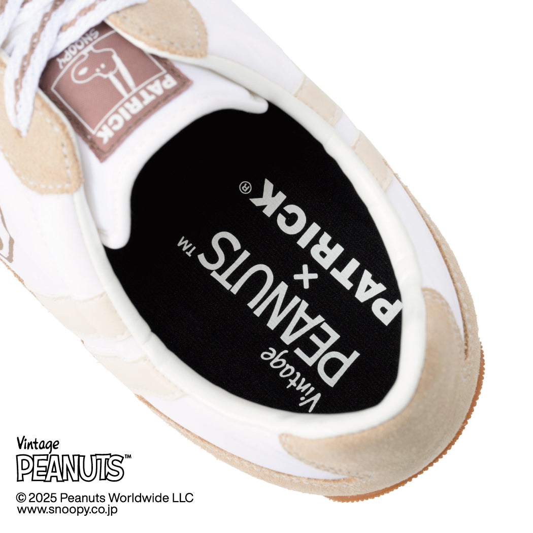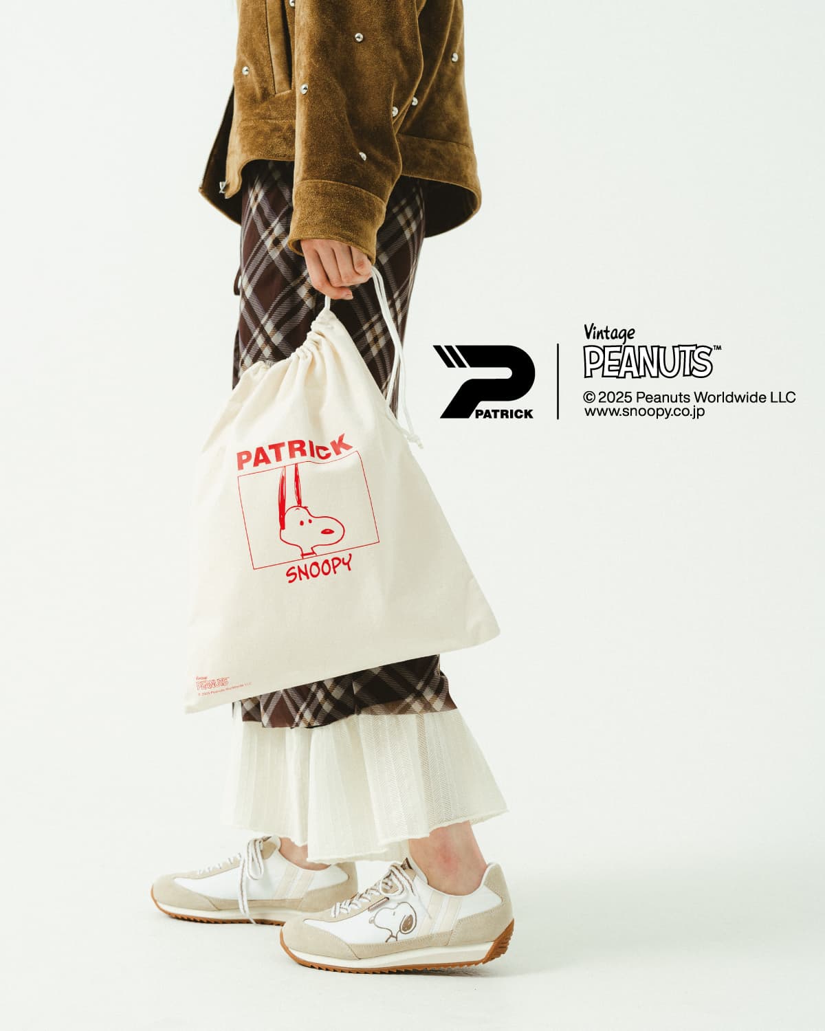 「マラソン」モデルをベースに、スヌーピーの愛らしい表情を左右の外側にプリントしています。シュータンネームには、スヌーピーの耳を立ち上げたデザインを施し、まるでパトリックの象徴である2本ラインのようなアートを表現。シューレースにはギザギザ模様の入ったデザインを採用し、PEANUTSの世界観を細部まで楽しめる仕上がりになっています。