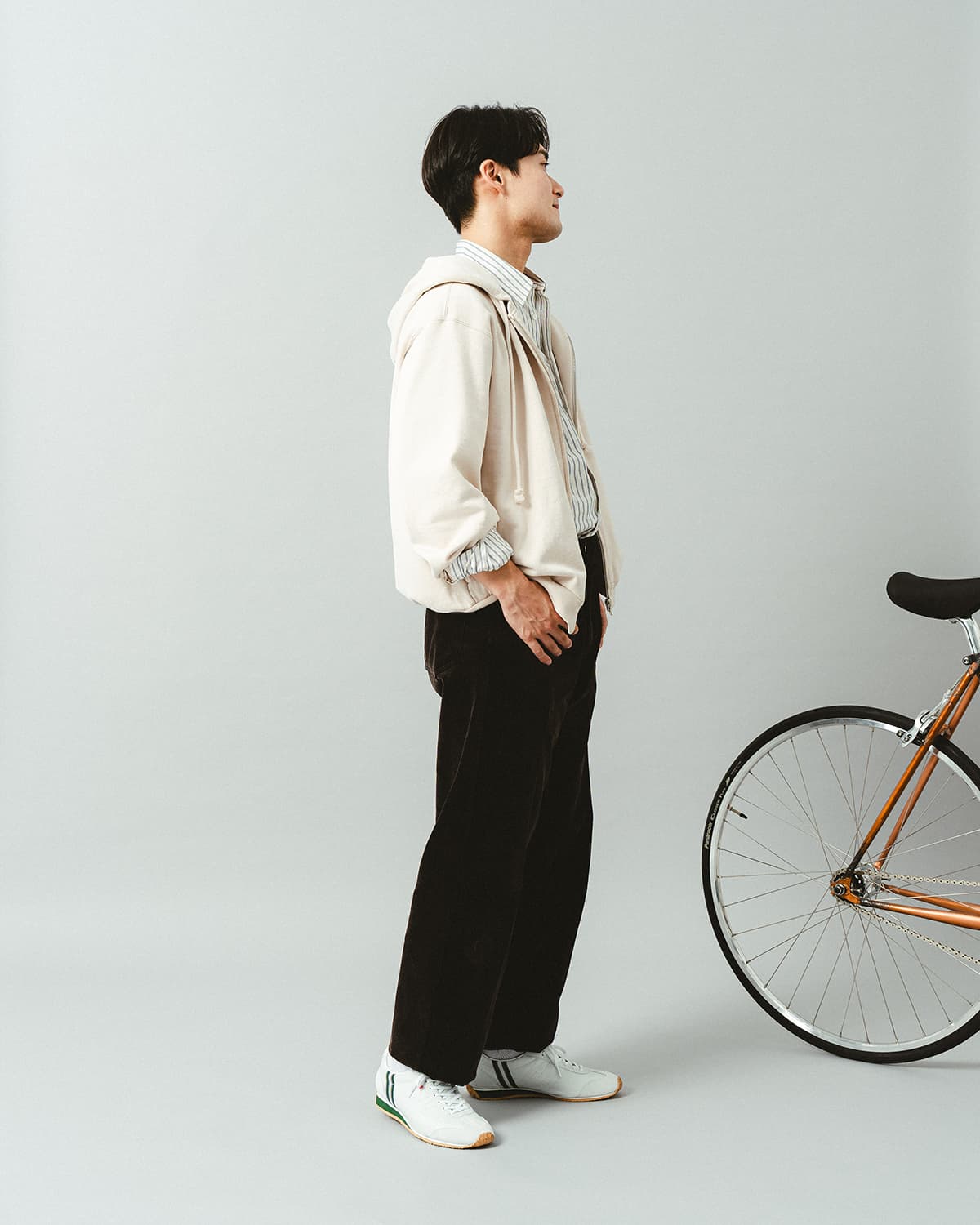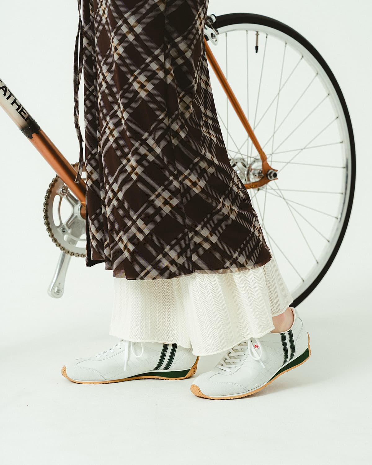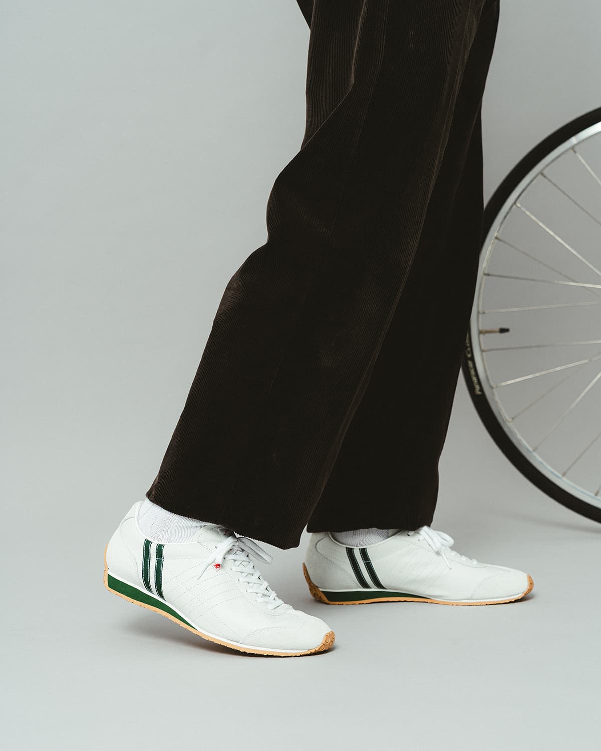 シーズンが深まるほど重たくなりがちな装いに、ホワイト×グリーンの爽やかな差し色は絶妙な抜け感です。デニムはもちろん、ウールパンツやトラックジャケットなど幅広いスタイリングにマッチ。男女問わず、秋冬の“重たい足元問題”を軽やかに解決する万能な相棒になってくれます。