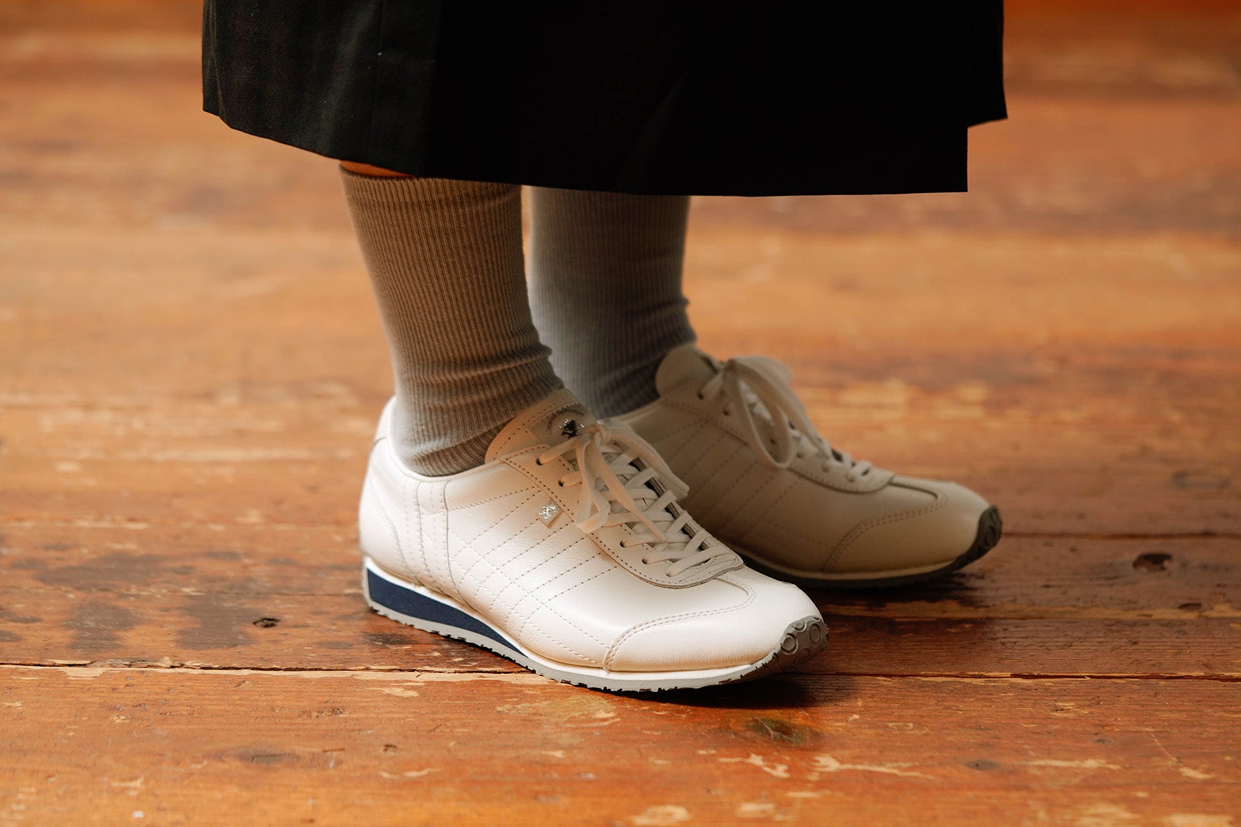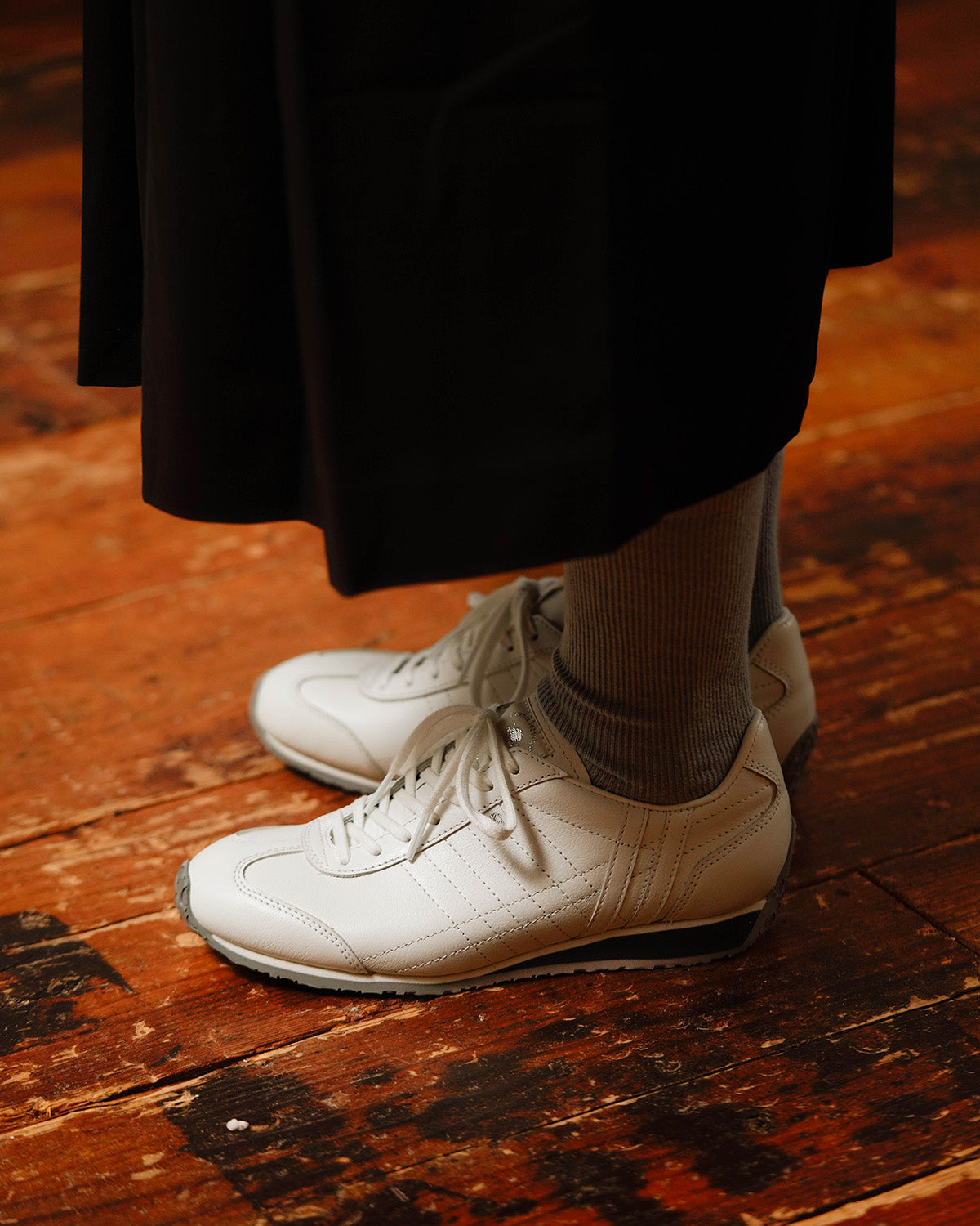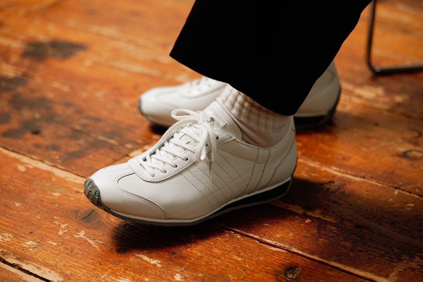 2019年春夏に復刻された「SALT(ソルト)」は、ホワイトベースに施された同色の2本ラインがさりげないアクセント。控えめながらもPATRICKらしい個性が光るデザインです。ネイビーとグレーのソール配色が全体を引き締め、足元に上品なコントラストをもたらします。シンプルでありながら、細部にまでこだわり抜いた美しいバランスが魅力の一足です。