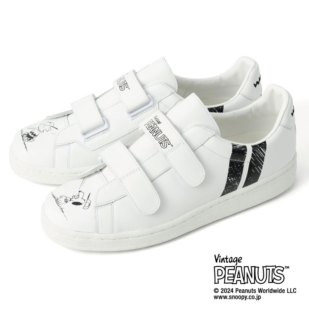 PATRICKの定番のベルトタイプのOCEANをベースに左右のつま先部分に打つチャーリー・ブラウンと口でキャッチするスヌーピーをそれぞれプリントしたデザイン。サイドの2本線はプリントにてかすれた感じを表現し、踵部分のギザギザは刺繍。