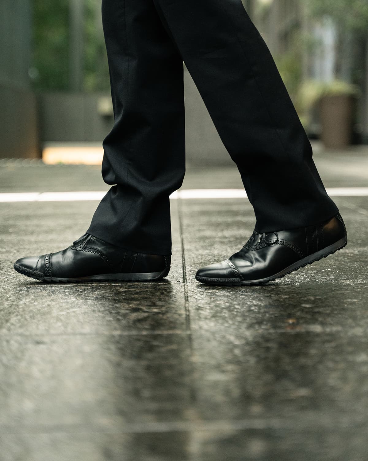側面から見ると分かるソール部分は、営業などで歩き回る方にとってオススメのポイント。ソールが気持ち巻き上がっているため、出張時の運転にも最適です。