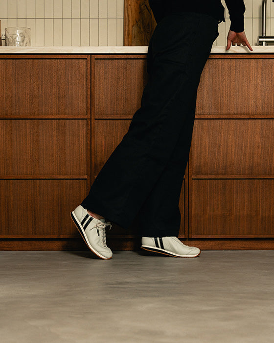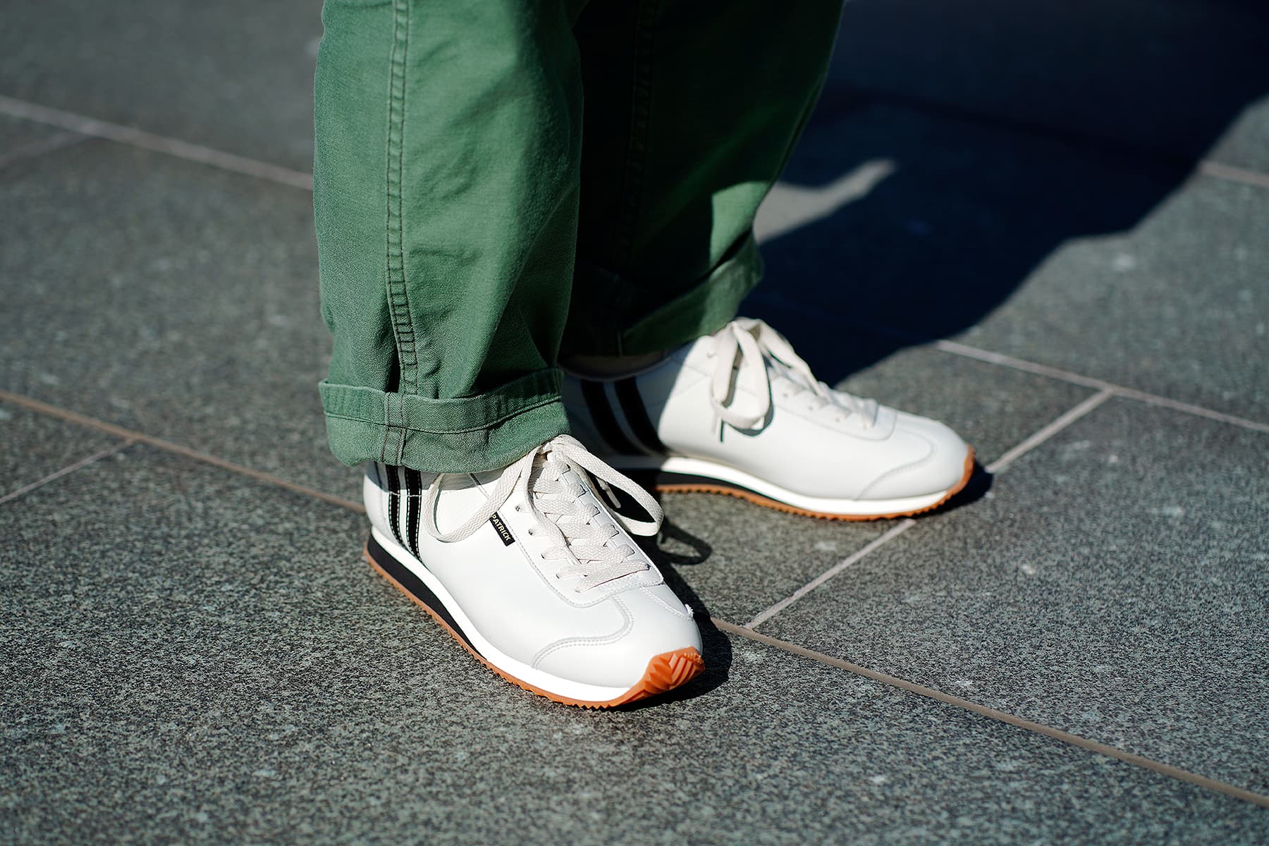 レザースニーカーでありながら、軽やかな履き心地と安定感を両立。クッション性のあるインソールが足の負担を軽減し、日常使いから長時間の歩行まで幅広く対応します。アメ色のアウトソールはグリップ力にも優れ、快適な歩行をサポートしてくれます。