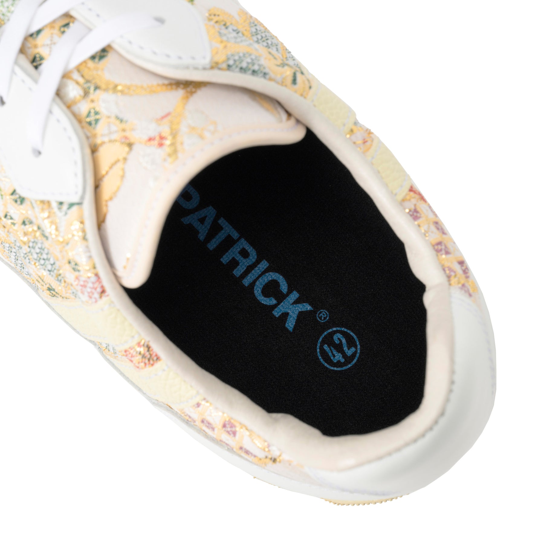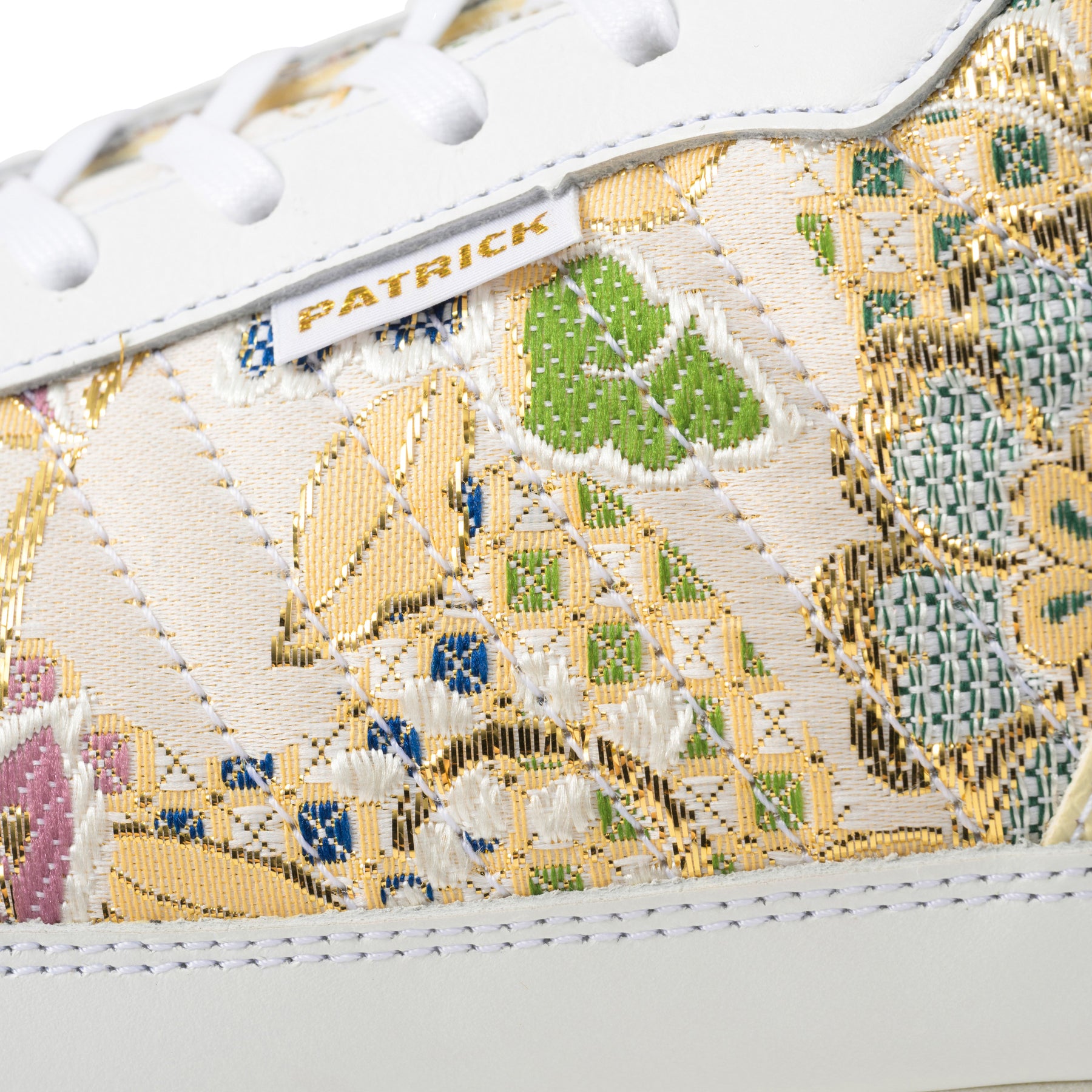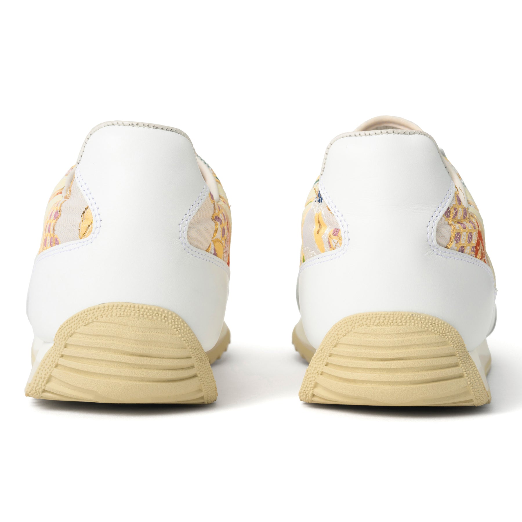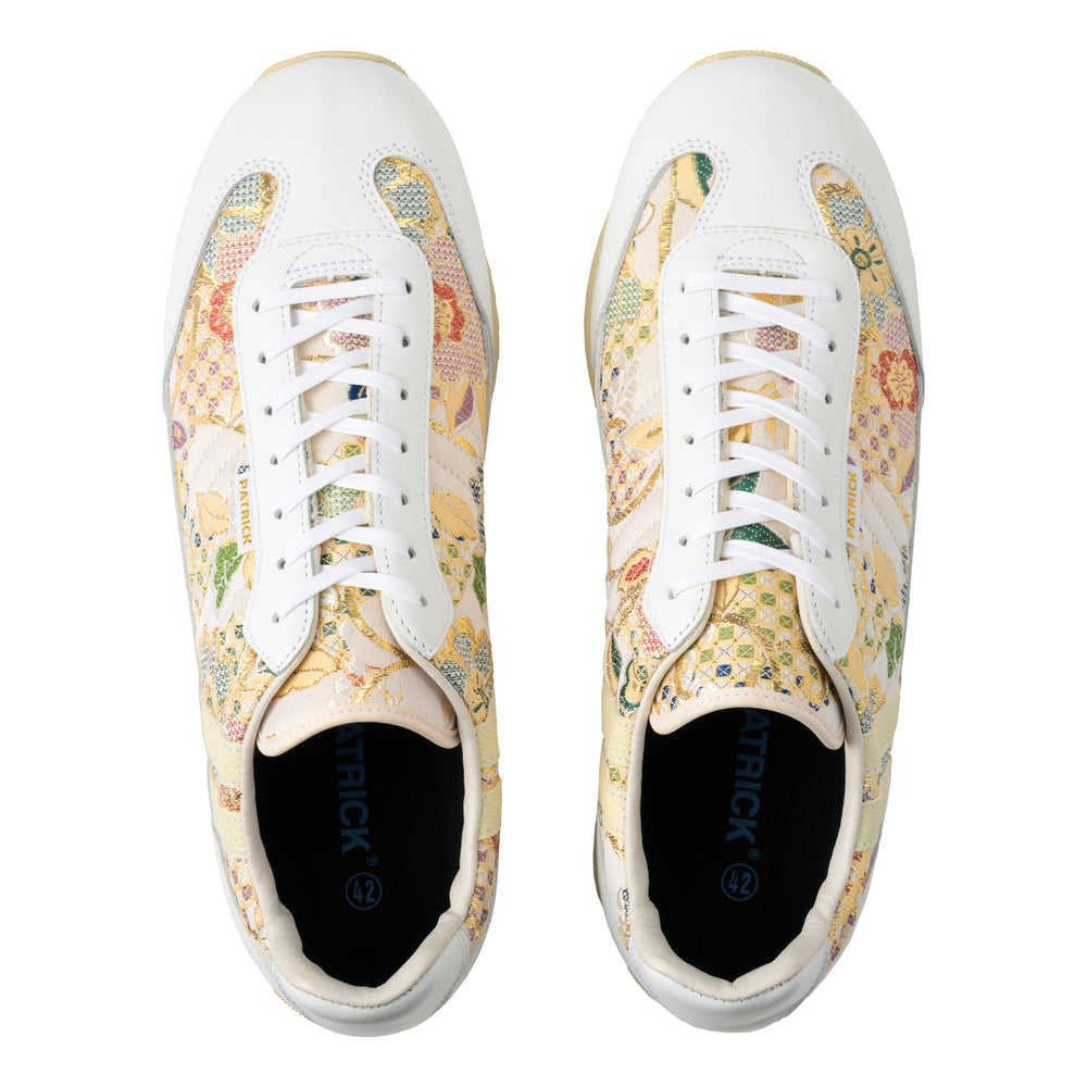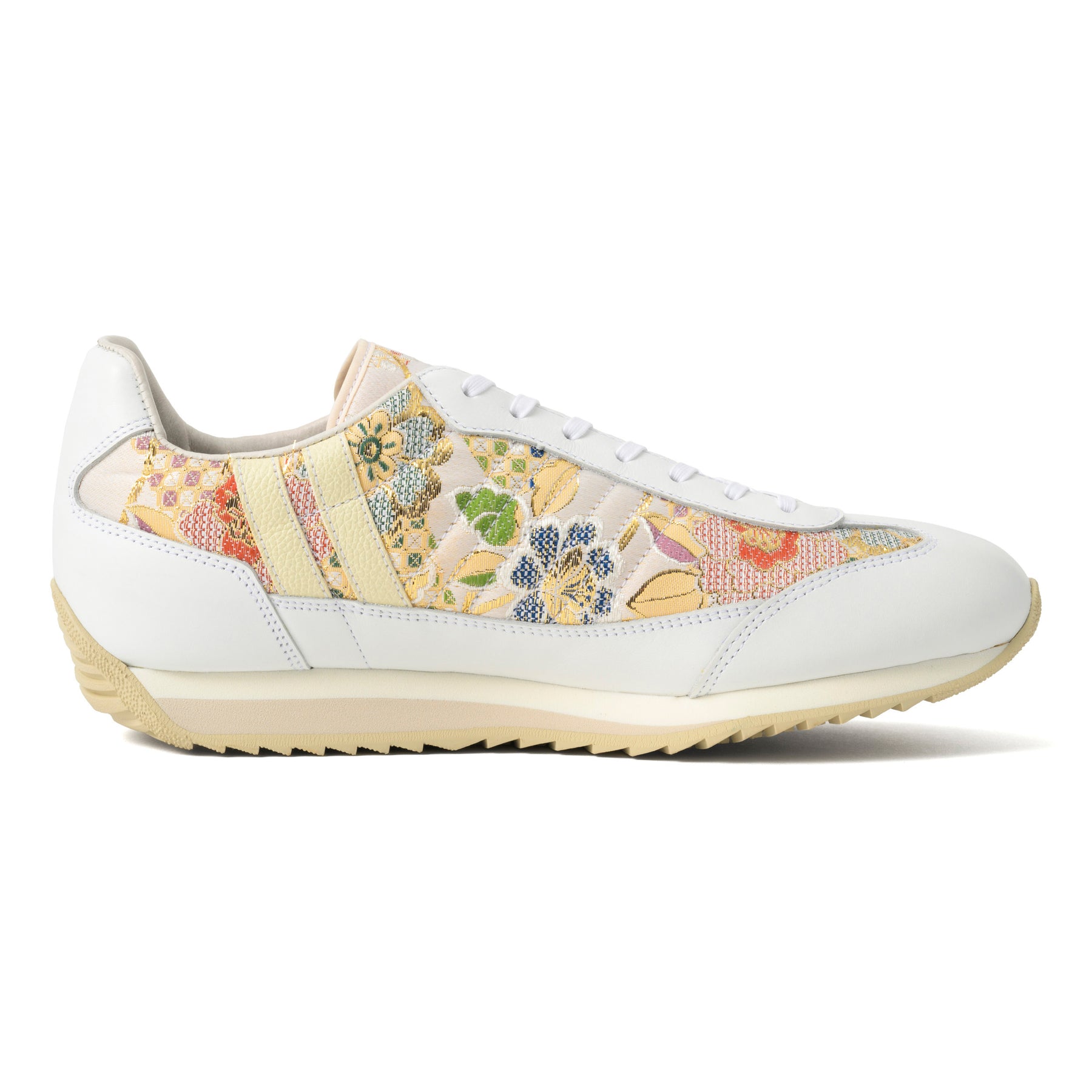 MARATHON-ORI(マラソン・オリ)は、日本の伝統工芸に現代的なスニーカーデザインを融合させた画期的なコレクションです。このモデル最大の特徴は、アッパー素材に創業100年以上の歴史を誇る老舗による「西陣織金襴」を採用している点にあります。大きめの花柄紋様に金糸が織り込まれたこの華やかな素材は、一足一足が芸術品のような美しさを演出し、他のスニーカーとは一線を画する存在感を放ちます。補強部分には上質なホワイトのスムースレザーを使用することで、伝統的な和の美しさと現代的な洗練さが見事に調和した爽やかな印象のデザインに仕上がっています。